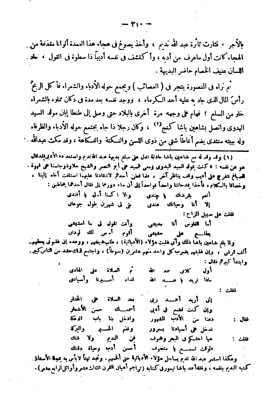 ولما بلغ شاهين باشا ذلك وأني غلبت هؤلاء "الأدباتية" طلب شيخهم، ووعده إن غلبوني يعطهم ألف قرش. وإن غلبتهم يضرب كل واحد من عشرين "سوطًا" واجتمع لذلك حشد من الناس كبير, وابتدأ كبيرهم فقال: