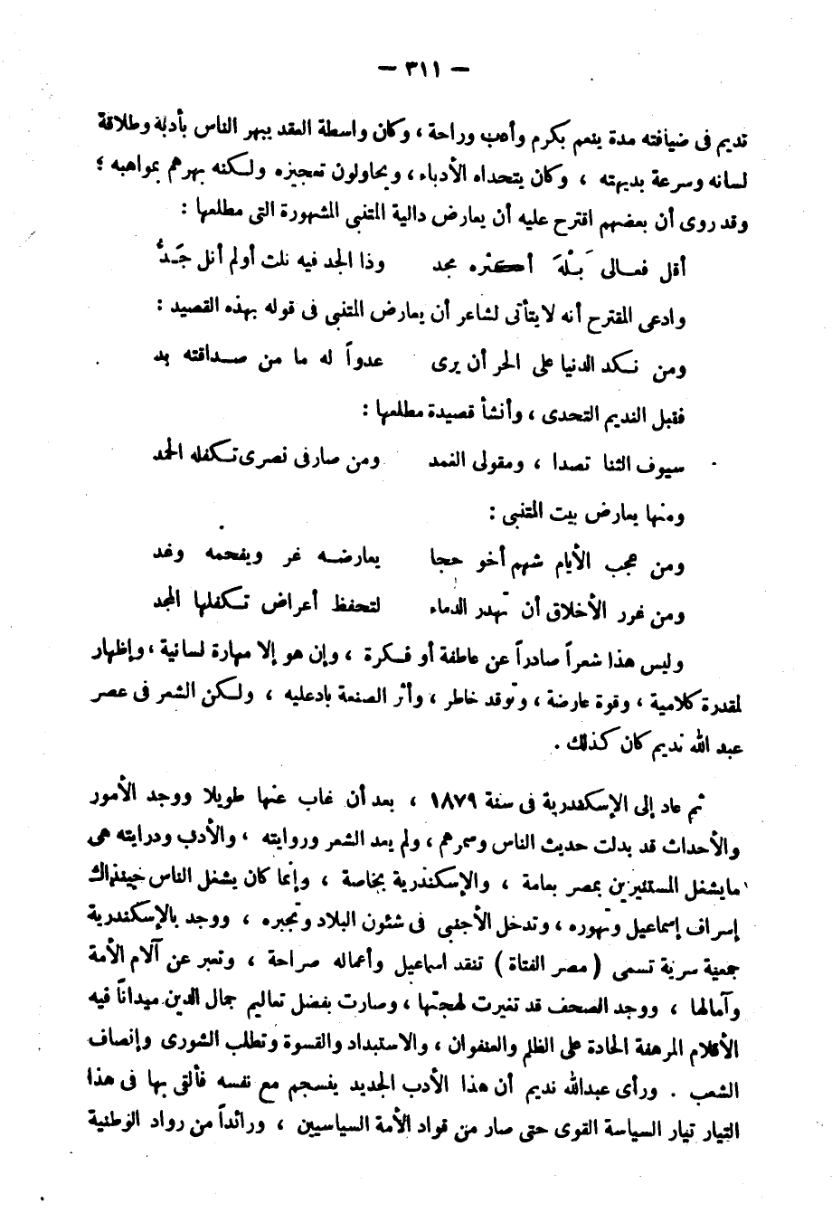 وليس هذا شعرًا صادرًا عن عاطفة أو فكرة، وإن هو إلّا مهارة لسانية، وإظهار لمقدرة كلامية، وقوة عارضة، وتوقد خاطر، وأثر الصنعة باد عليه، ولكن الشعر في عصر عبد الله نديم كان كذلك.
