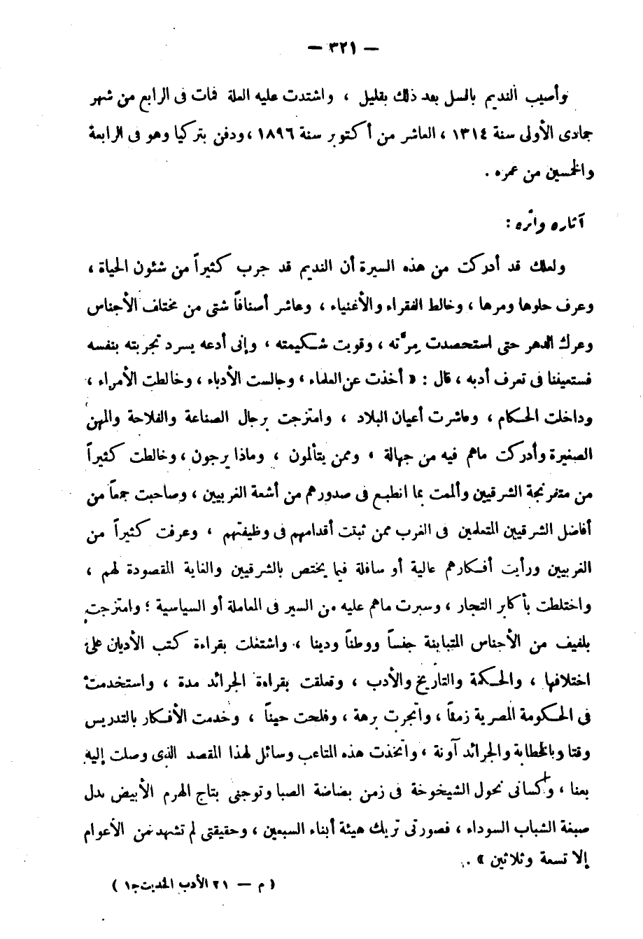 ولعلك قد أدركت من هذه السيرة أن النديم قد جرَّب كثيرًا من شئون الحياة، وعرف حلوها ومرها، وخالط الفقراء والأغنياء، وعاشر أصنافًا شتَّى من مختلف الأجناس, وعرك الدهر حتى استحصدت مرته، وقويت شكيمته، وإني أدعه يسرد تجربته بنفسه؛ فستعيننا في تعرف أدبه، قال: "أخذت عن العلماء، جالست الأدباء، وخالطت الأمراء، وداخلت الحكام، وعاشرت أعيان البلاد، وامتزجت برجال الصناعة والفلاحة والمهن الصغيرة, وأدركت ما هم فيه من جهالة، وممن يتألمون، وماذا يرجون، وخالطت كثيرًا من متفرنجة الشرقيين, وألممت بما انطبع في صدروهم من أشعة الغربيين، وصاحبت جمعًا من أفاضل الشرقيين المتعلمين في الغرب ممن ثبتت أقدامهم في وظيفتهم، وعرفت كثيرًا من الغربيين, ورأيت أفكارهم عاليةً أو سافلةً فيما يختص بالشرقيين والغاية المقصودة لهم، واخلتطت بأكابر التجار، وسبرت ما هم عليه من السير في المعاملة أو السياسة، وامتزجت بلفيف من الأجناس المتباينة جنسًا ووطنًا ودينًا، واشتغلت بقراءة كتب الأديان على اختلافها، والحكمة والتاريخ والأدب، وتعلقت بقراءة الجرائد مدةً، واستخدمت في الحكومة المصرية زمنًا، واتجرت برهةً، وفلحت حينًا, وخدمت الأفكار بالتدريس وقتًا, وبالخطابة والجرائد آونةً، واتخذت هذه المتاعب وسائل لهذا القصد الذي وصلت إليه بعناءٍ, وكساني نحول الشيخوخة في زمنٍ بضاضة الصبا, وتوجني بتاج الهرم الأبيض بدل صبغة الشباب السوداء، فصورتي تريك هيئة أبناء السبعين، وحقيقتي لم تشهد من الأعوام إلّا تسعة وثلاثين".