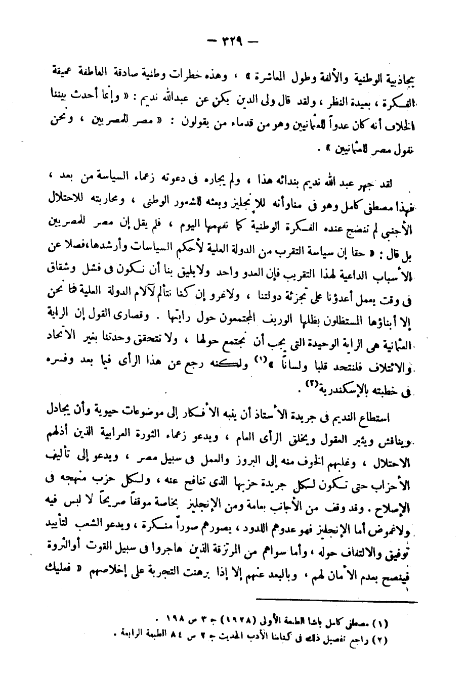 لقد جهر عبد الله نديم بندائه هذا، ولم يجاره في دعمته زعماء السياسة من بعد، فهذا مصطفى كامل وهو في مناوأته للإنجليز, وبعثه للشعور الوطنيّ, ومحاربته للاحتلال الأجنبيّ, لم تنضج عنده الفكرة الوطنية كما نفهمها اليوم، فلم يقل: إن مصر للمصريين, بل قال: "حقًّا إن سياسة التقرب من الدولة العلية لأحكم السياسات وأرشدها، فضلًا عن الأسباب الداعية لهذا التقريب, فإن العدو واحد ولا يليق بنا أن نكون في فشل وشقاق في وقت يعمل أعداؤنا على تجزئة دولتنا، ولا غرو إن كنا نتألم لآلام الدولة العلية, فما نحن إلّا أبناؤها المستظلون بظلها الوريف, المجتمعون حول رايتها، وقصارى القول أن الراية العثمانية هي الراية الوحيدة التي يجب أن يجتمع حولها، ولا تتحقق وحدتنا بغير الاتحاد والائتلاف, فلنتحد قلبًا ولسانًا"1 ولكنه رجع عن هذا الرأي فيما بعد, وفسره في خطبته بالإسكندرية2.
