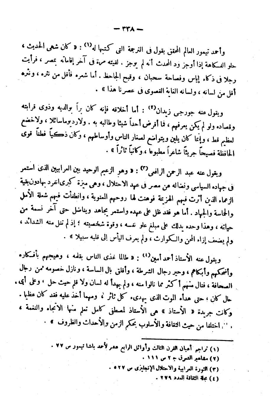 ويقول عنه الأستاذ أحمد أمين3: "طالما غذى الناس بقلمه، وهيجهم بأفكاره, وأضحكهم وأبكاهم، وحيّر رجال الشرطة، وأقلق بال الساسة، ونازل خصومه من رجال الصحافة، فنال منهم أكثر مما نالوا منه، ولم يهدأ له لسان ولا قلم حيث حلّ، وعلى أي حالٍ كان، حتى هدأه الموت الذي يهدئ كل ثائر، ومهما أخذ عليه فقد كان عظيمًا، وكانت جريدة "الأستاذ" هي الأستاذ لمصطفى كامل, تعلم منها الاتجاه والنغمة، وإن اختلفا من حيث الثقافة والأسلوب بحكم الزمن والأحداث والظروف".
