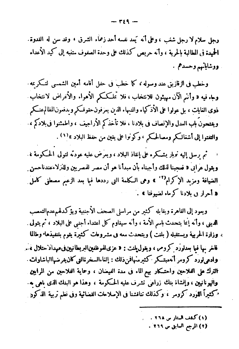 ويعود إلى القاهرة, ويقابله كثير من مراسلي الصحف الأجنبية, ويؤكد لهم عدم التعصب الديني، وأنه إنما يتحدث باسم الأمة، وأنه سيقاوم كل اعتداء أجنبيٍّ على البلاد، ثم يتولى وزارة الحربية, ويستقبله "بلنت" ويتحدث معه في مشروعات كثيرة يقوم بتنفيذها، وطالما فخر بها فيما بعد لورد كرومر، ويقول بلنت: "عزي للموظفين البريطانيين في عهد الاحتلال، وادعى لورد كرومر أنه مبتكر كثير منها, فمن ذلك: إلغاء السخرة التي كان يفرضها الباشاوات الترك على الفلاحين, واحتكار بيع الماء في مدة الفيضان، وحماية الفلاحين من المرابين واليونانيين، وإنشاء بنك زراعي تشرف عليه الحكومة، وهذا هو البنك الذي باهى به كثيرًا اللورد كرومر، وكذلك تنقاشنا في الإصلاحات القضائية, وفي نظم تربية الذكور والإناث، وفي طريقة الانتخاب للبرلمان الجديد وفي مسألة الرقيق"1.