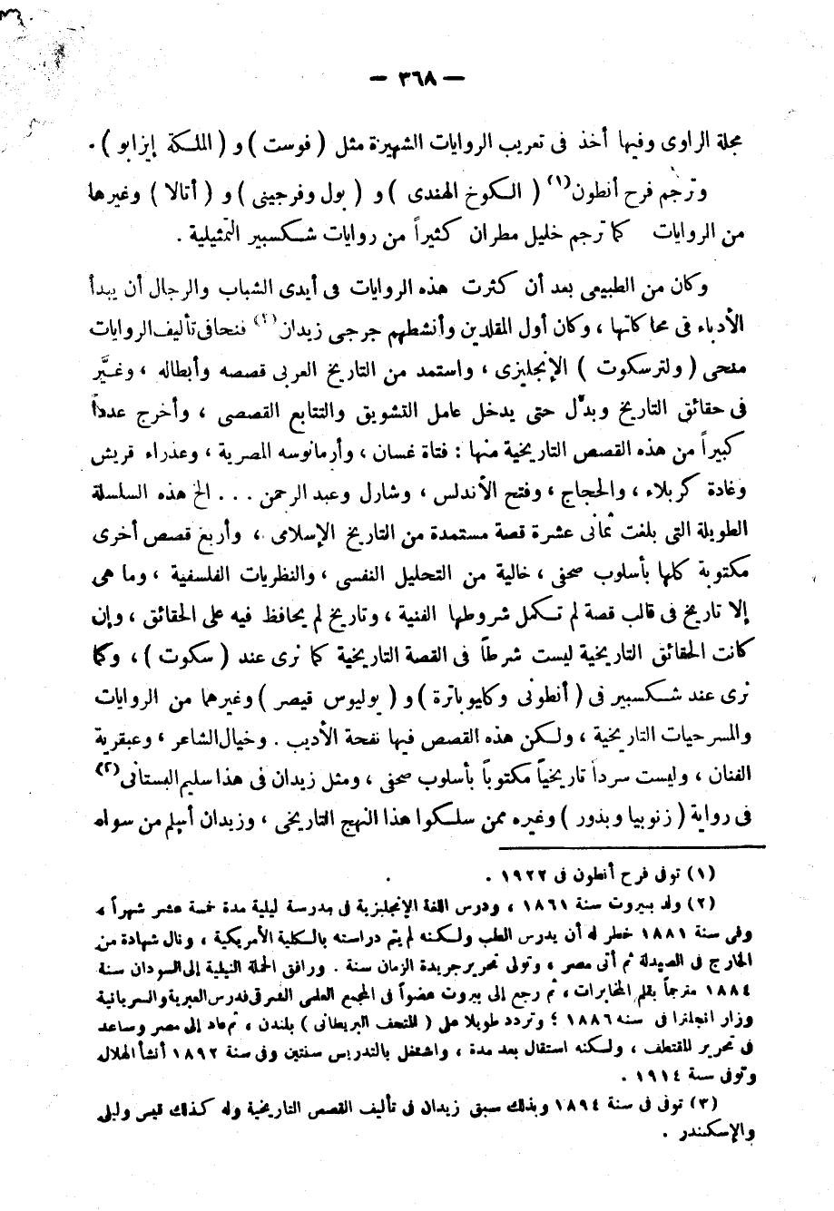 أما "الأدب" وهو الذي يعنينا في كتابنا هذا أكثر من سواه، فقد اشتدت فيه حركة التعريب، ولا سيما الروايات والقصص، وقد عرفت فيما سبق أن الكلية الأمريكية ببيروت أسست سنة 1860, ثم أسست الكلية اليسوعية بعدها بقليل، وقد كان لهاتين الكليتين أثرٌ بارزٌ في توجيه النشء إلى القصة الغربية، ولما هاجر كثير من نصارى لبنان إلى مصر؛ حيث الحرية والشهرة والثورة, أخذ هؤلاء المهاجرون يترجمون القصص الأوربيّ ويذيعونه في الناس، وكانت بيروت قد شهدت من قبل قيام "مارون نقاش" يؤلف بعض المسرحيات أو يقتبسها من الأدب الغربيّ؛ مثل مسرحية: "البخيل" لـ "موليير"، وكان يدعو فنه هذا "الذهب الإفرنجي المسبوك" وكان لمارون ابن أخٍ اسمه سليم نقاش, رحل بعد موت عمه إلى مصر، وسعى فيها حتى أنشأ مسرحًا وفرقةً، وظهر بمصر في ذلك الوقت رجل يهوديّ اسمه "يعقوب صنوع", أسس مسرحًا عربيًّا بالقاهرة ترجم له عشرات