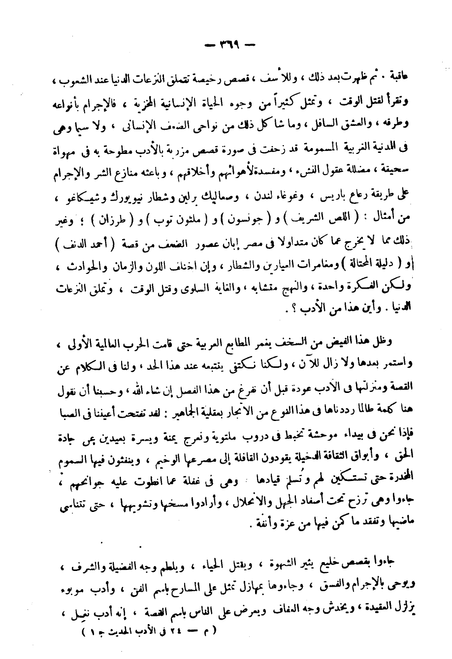الروايات الفرنسية الغرامية بلغة عامية ركيكة, وقد تقدم الكلام عنه1، وظل المسرح منذ ذلك الوقت يعتمد على الرويات الأجنبية الممصرة، وأحيانًا يضع له بعض المؤلفين مسريحاتٍ لا تمثل الحياة المصرية في شيء، وبها كثير من عادات الغرب وتقاليده, ولم يتجه المسرح وجهة إصلاحية إلّا نادرًا, مثل ما مر بك من روايات عبد الله نديم وأضرابه2.