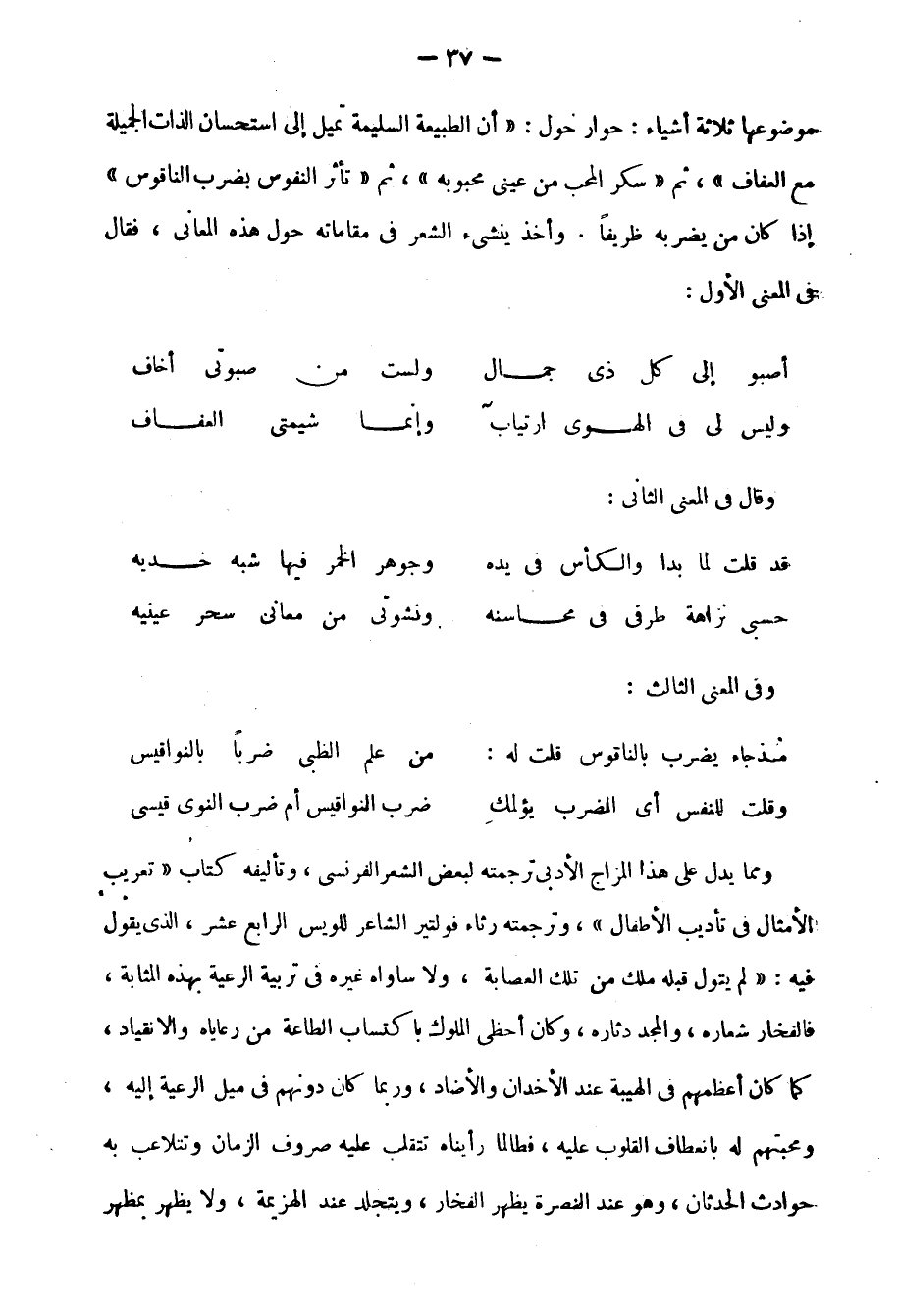 ومما يدل على هذا المزاج الأدبيّ ترجمته لبعض الشعر الفرنسيّ، وتأليفه كتاب "تعريب الأمثال في تأديب الأطفال"، وترجمته رثاء فولتير الشاعر للويس الرابع عشر، الذي يقول فيه: