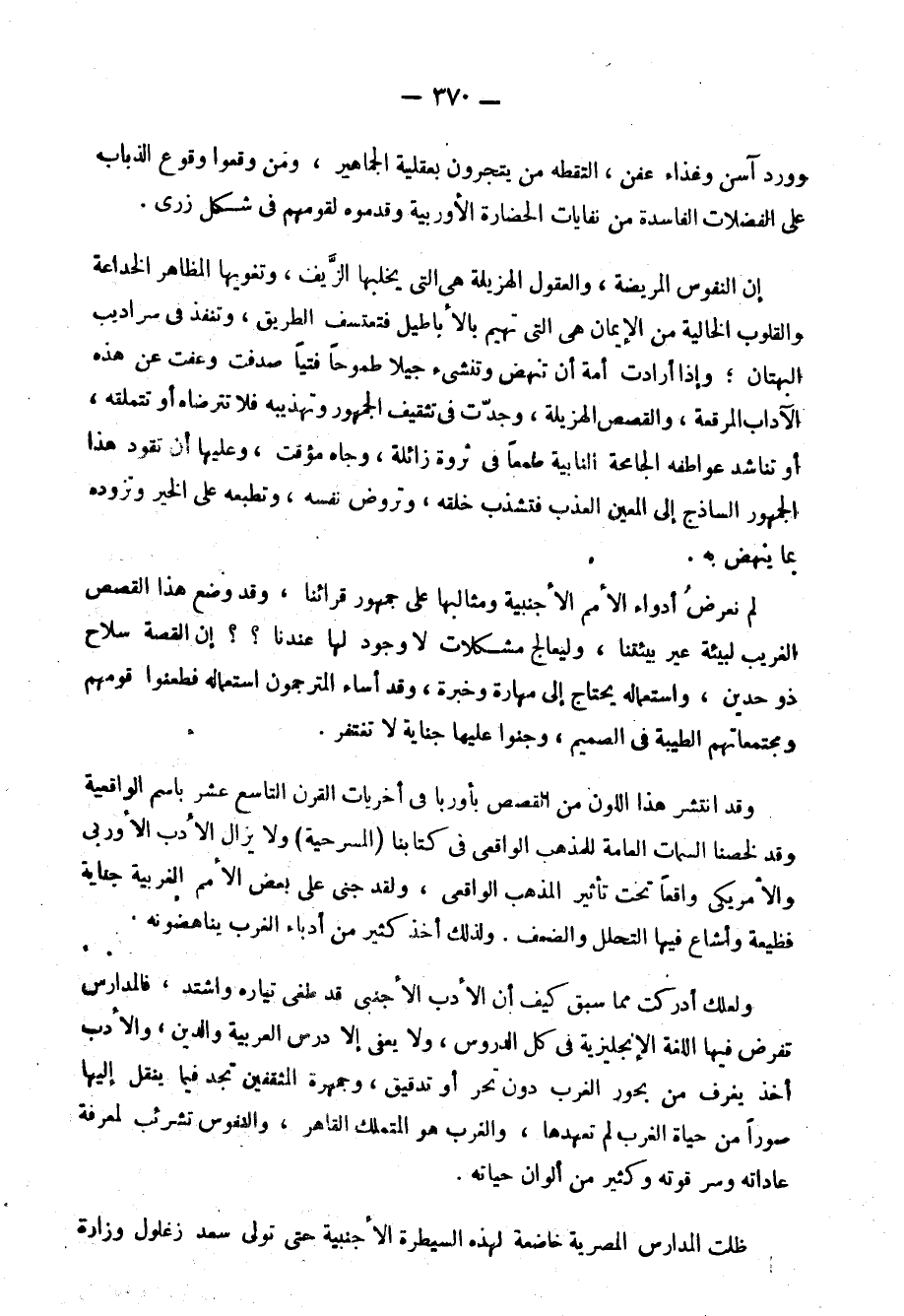 وكان من الطبيعيّ بعد أن كثرت هذه الرويات في أيدي الشباب والرجال, أن يبدأ الأدباء في محاكاتها، وكان أول المقلدين وأنشطهم جرجي زيدان2, فنحا في تأليف الروايات منحى "ولترسكوت" الإنجليزي، واستمد من التاريخ العربيّ قصصه وأبطاله، وغيَّرَ في حقائق التاريخ وبدَّلَ حتى يدخل عامل التشويق والتتابع القصصي, وأخرج عددًا كبيرًا من هذه القصص التاريخية؛ منها: فتاة غسّان، وأرمانوسه المصرية، وعذارء قريش, وغادة كرباء، والحجاج، وفتح الأندلس، وشارل وعبد الرحمن، إلخ هذه السلسلة الطويلة التي بلغت ثماني عشرة قصة مستمدة من التاريخ الإسلاميّ، وأربع قصص أخرى مكتوبة كلها بأسلوب صحفيّ، خالية من التحليل النفسي، والنظريات الفلسفية, وما هي إلّا تاريخ في قالب قصة لم تكمل شروطها الفنية، وتاريخ لم يحافظ فيه على الحقائق، وإن كانت الحقائق التاريخية ليست شرطًا في القصة التاريخية, كما نرى عن "سكوت"، وكما نرى عند شكسبير في "أنطوني وكليوباترة", "يوليوس قيصر" وغيرهما من الروايات والمسرحيات التاريخية، ولكن هذه القصص فيها نفحة الأديب، وخيال الشاعر، وعبقرية الفنان، وليست سردًا تاريخيًّا مكتوبًا بأسلوب صحفيّ، ومثل زيدان في هذا سليم البستاني2 في رواية "زنوبيا وبدور" وغيره ممن سلكوا هذا النهج التاريخي، وزيدان أسلم من سواه عاقبة، ثم ظهرت بعد ذلك، وللأسف قصص رخيصة تتملق النزعات الدنيا عند الشعوب، وتقرأ لقتل الوقت، وتمثل كثيرًا من وجوه الحياة الإنسانية المخزية، فالإجرام