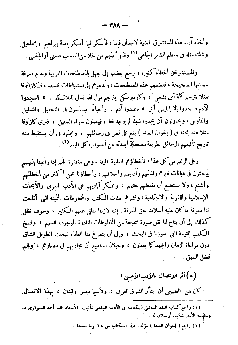 أجل! إننا لا نبرئ كثيرًا منهم من التعصب، ولا سيما في المسائل التي تتعلق بالدين والعقيدة والجنس، وهيهات أن يكتب أحد عن الإسلام أو عن العرب دون أن ينزع في كتاباته إلى ما ينم عن تعصبه, وقليل منهم مَن استطاع أن يتجرد من عواطفه ونزعاته حين البحث؛ مثل: "السير توماس أرنولد" في كتابه "الدعوة إلى الإسلام".