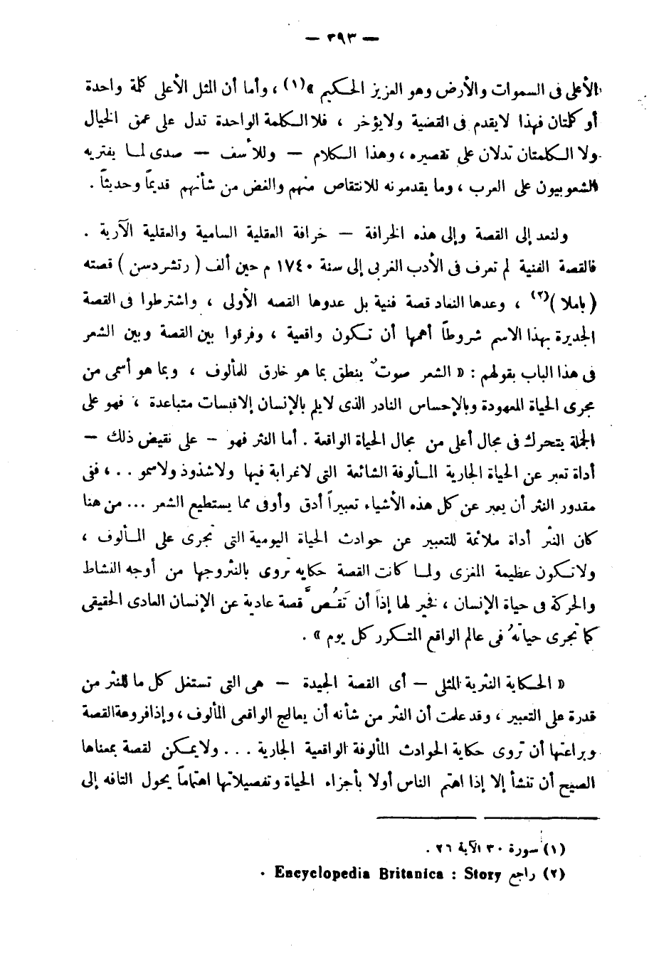 فيها آثارًا لا تزال ناطقة, ولا سماء صاخبة متقلبة مزمجرة هادرة، ولا جبال يكسوها الثلج فيخطف البصر ويظهر جبروت الطبيعة؛ فلا بدع إذا جاء الخيال الساميّ صورة من هذه الصحراء، وعلى العكس من ذلك البيئة التي عاش فيها الآريون قبل أن يدخلوا إلى أوربان وهي شمال بلاد الهند، فإن الطبيعة فيها قاسية قسوة عارمة، والمناظر متنوعة، والغابات كثيفة دكناء, والجو متلقب لا يستقر على حال, فالرعود القاصفة، والريح العاصفة, والمطر الهطال, والبروق الخطافة, والسحب تتراكم في السماء كأنها جيوش يدفع بعضها بعضًا, وقد بثت هذه الطبيعة في نفس الإنسان الذي عاش في أحضانها شيئًا من الخشية والرعب وألهمته الأساطير والخرافات، فكان ذلك بدء القصة، وقد اختزن العقل الأوربي من صور هذه الحياة الأولى شيئًا غير قليل، وكان له بهذا الخيال المجنح والعقلية الخصبة، والنظرة الفاحصة، وهذه المواهب هي القصة.