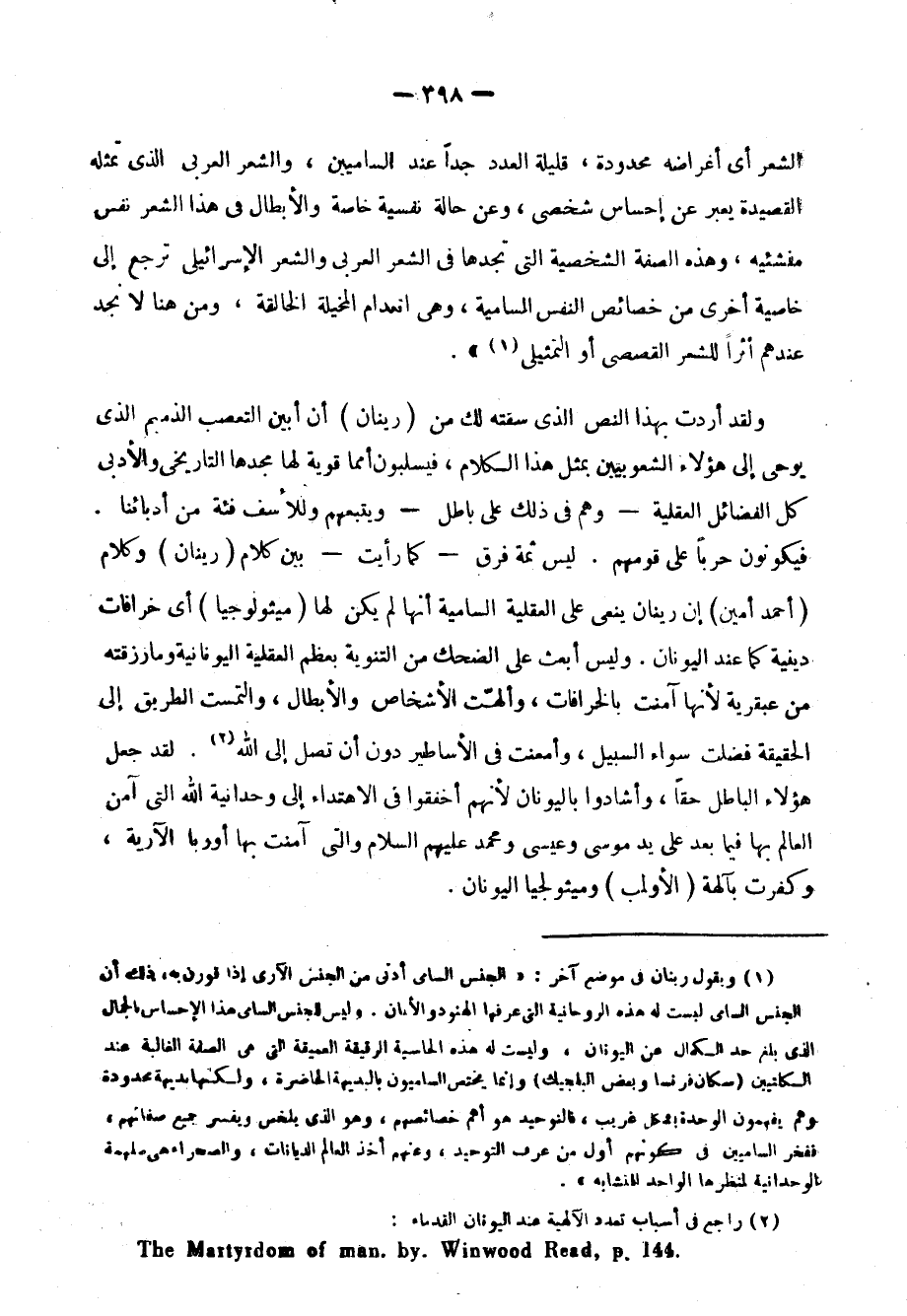 إن أسطورة العقل الآري وفضله على العقل السامي, التي طالما رددها أدباؤنا من غير أن يفطنوا إلى ما فيها من شعوبية كامنة، ومن غير أن يتبينوا وجه الصواب بعد أن غشى عليهم الحق ما عليه الشعوب العربية من هوان وضعف، فاعتقدوا باطلًا أن الحق مع القوة, وأن العقلية الآرية لابد أن تكون متفوقة ما دام أصحاب هذه العقلية هم المسيطرون على شعوب الأرض, إن هذه الأسطورة تنم عن تعصبٍ مكينٍ في نفوس قائليها, وعلى مغالطة ظاهرة، فهذا "أرنست رينان" وهو من غلاة الشعوبيين وأشدهم قسوةً على العرب ودينهم, والساميين وعلقليتهم, يقرر ما أورده أحمد أمين, ويحقر من العقلية السامية1 ويقول: "يبدو أن التفكير الفلسفيّ للبحث عن الحقيقة كان وقفًا على الجنس المسمى بالهندي الأوربي, أو الآري الذي يمتد من الهند إلى أقصى الغرب, وإلى أقصى الشمال، والذي كان يبحث منذ أقدم العصور إلى الآن في تفسير الله والإنسان والعالم تفسيرًا عقليًّا, وقد ترك وراءه في كل مراحل تاريخه آثارًا فلسفية خاضعة لنواميس تطور منطقي، أما الساميون فإنهم بدون تفكير أو تدليل -أي بدون