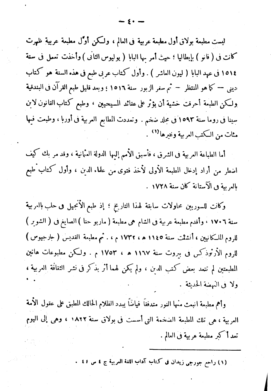 أما الطباعة العربية في الشرق، فأسبق الأمم إليها الدولة العثمانية، وقد مَرَّ بك كيف اضطر من أراد إدخال المطبعة الأولى لأخذ فتوى من علماء الدين، وأول كتابٍ طبع بالعربية في الآستانة كان سنة 1728.
