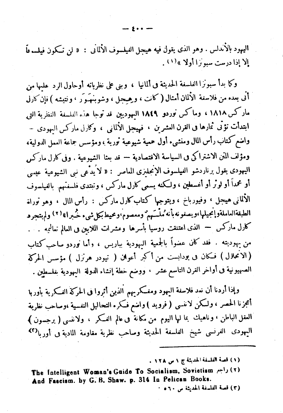 ولعلك تعجب إذا قررنا لك أن المدنية الأوربية الحديثة بنظمها الاجتماعية والسياسية والاقتصادية, وحياتها العلمية هي من أثر العقلية السامية قديمًا؛ حين تتلمذوا على العرب وشروحهم للفلسفة اليونانية والطب والكيمياء والجبر والهندسة وغيرها، وحديثًا ممثلةً في بني إسرائيل الذين نزحوا إليها من مئات السنين بعد أن عاشوا طويلًا في الصحراء، ولو كانت البيئة الصحراوية لا تنتج إلّا عقولًا مجدبة وخيالات ضحلة، وفكرًا غير قادر على الخلق والابتكار، ونفسًا لا تعرف الفلسفة ولا تقدرها, لظل اليهود كذلك في رحلتهم الدائمة بأوربا مهما تغيرت بهم البلاد والبيئات، ولكنا نرى الأوربيين في كثير من الأحيان يعترفون للتوارة بالفضل، وللشعب الإسرائيلي وليد الصحراء بالعبقرية والنبوغ، والعقلية السامية متكافئة في اقتدارها وعالميتها، واللغة العربية والعبرية توأمان نشأتا من أصل واحد, وهذا "رينان" يقول: "ليس في ماضي النوع الإنساني ما يثير اهتمام الفكر الفلسفيّ سوى تاريخ ثلاث شعوب، تاريخ إسرائيل، والتاريخ الإغريقي، والتاريخ الروماني".