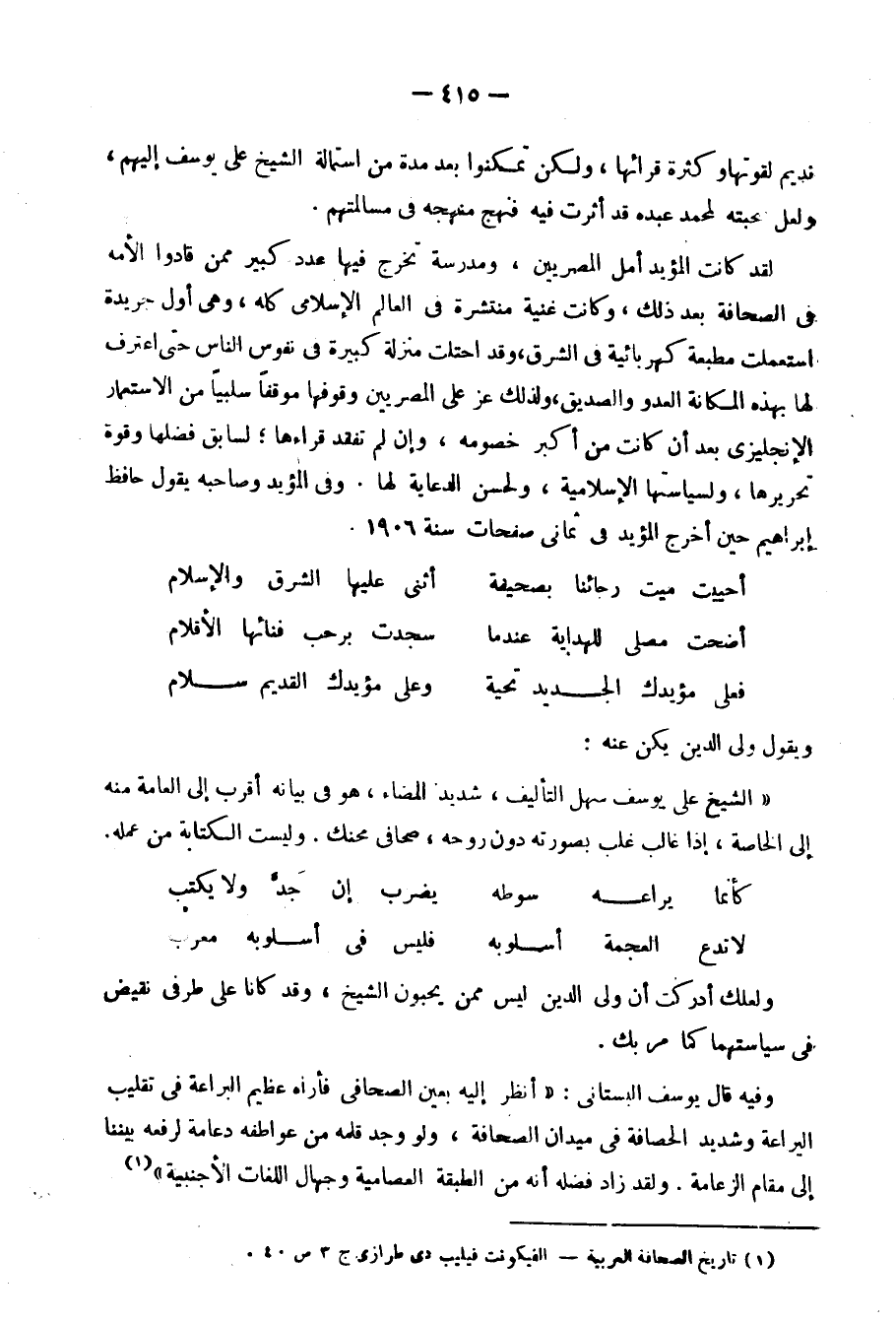1 الشيخ علي يوسف صاحب المؤيد، ولد بقرية بلصفورة بمدينة جرجا سنة 1863, من أسرة شريفة أخنى علهيا الدهر، ودرس في الأزهر مدةً إلّا أن ميله الأدبي صرفه عن إتمام دروسه به، وأنشأ في سنة 1887 "مجلة الآداب" أسبوعية في ثماني صفحات، ولكنها اهتمت بالدراسات القديمة، وحررت بأسلوب يعلو على جمهرة القراء، فتعثرت في خروجها، ثم أسس جريدة المؤيد في أول ديسمبر سنة1889، فكانت أول جريدة مصرية يومية كبيرة، وراجت رواجًا عظيمًا, وفي سنة 1913 أسند للشيخ علي ييوسف مشيخة السادة الوفائية، فاستقال من جريدته، ومات بعد ذلك في سنة 1913, وكان الشيخ "علي " قوي العزم, أديبًا متلافًا وقد أثار زواجه من بنت السيد عبد الخالق السادات ضجةً عظيمةً؛ لأن السيد عبد الخالق عده دونه في الحسب والنسب، وشغلت الصحف بذلك وقتًا طويلًا، وقد رمي بالتعصب الديني، ولكنها تهمة يشيعها من لم يفهموا سياسة ذلك الوقت, والعوامل التي حركت الصحافة, والدوافع التي جعلت من بعض المسلمين متعصبين, وسنخصه بترجمة مطولة في أحد الأجزاء التالية -إن شاء الله, على أننا ترجمنا له ترجمة وافية بمجلة الكتاب, عدد يولية 1948, وفي كتابنا "دراسات أدبية".
