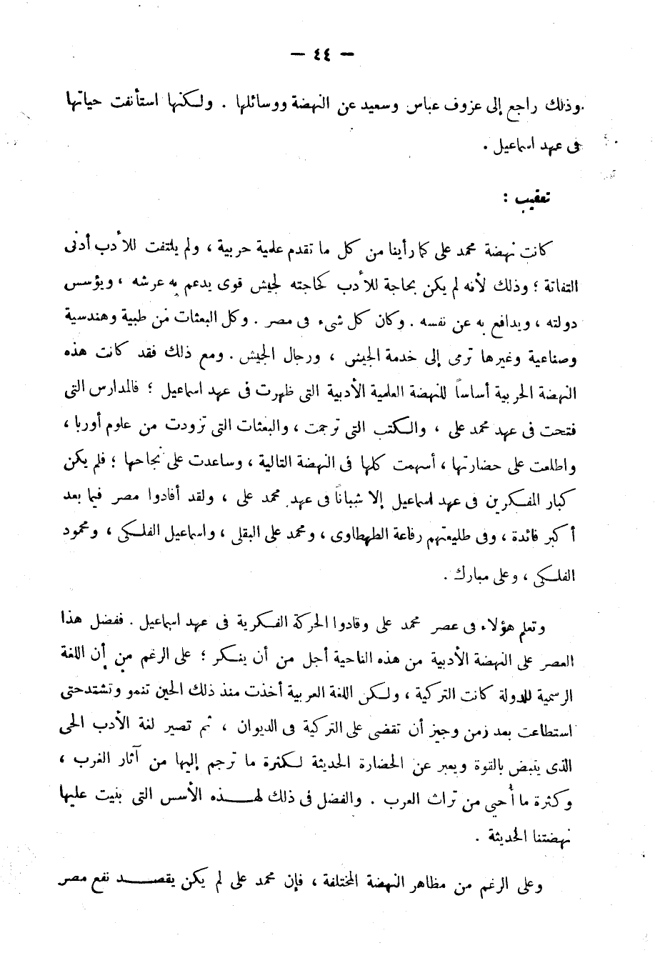وتعلَّم هؤلاء في عصر محمد علي, وقادوا الحركة الفكرية في عهد إسماعيل، ففضل هذا العصر على النهضة الأدبية من هذه الناحية أَجَلّ من أن ينكر، على الرغم من أن اللغة الرسمية للدولة كانت التركية، ولكن اللغة العربية أخذت منذ ذلك الحين تنمو وتشتد, حتى استطاعت بعد زمنٍ وجيزٍ أن تقضي على التركية في الديوان، ثم تصير لغة الأدب الحيِّ الذي ينبض بالقوة, ويعبر عن الحضارة الحديثة؛ لكثرة ما ترجم إليها من آثار الغرب، وكثرة ما أحيا من تراث العرب، والفضل في ذلك لهذه الأسس التي بنيت عليها نهضتنا الحديثة.
