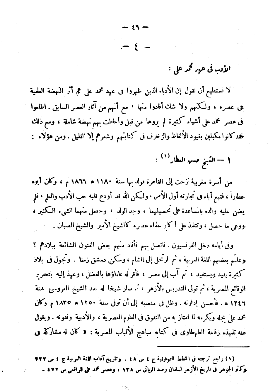 لا نستطيع أن نقول أن الأدباء الذين ظهروا في عهد محمد علي هم أثر النهضة العلمية في عصره، ولكنهم ولا شكَّ أفادوا منها، مع أنهم من آثار العصر السابق، اطلعوا في عصر محمد علي على أشياء كثيرة لم يروها من قبل، وأحاطت بهم نهضة شاملة، مع ذلك, فقد كانوا مكبلين بقيود الألفاظ والزخارف في كتبابتهم وشعرهم إلّا القليل، ومن هؤلاء: