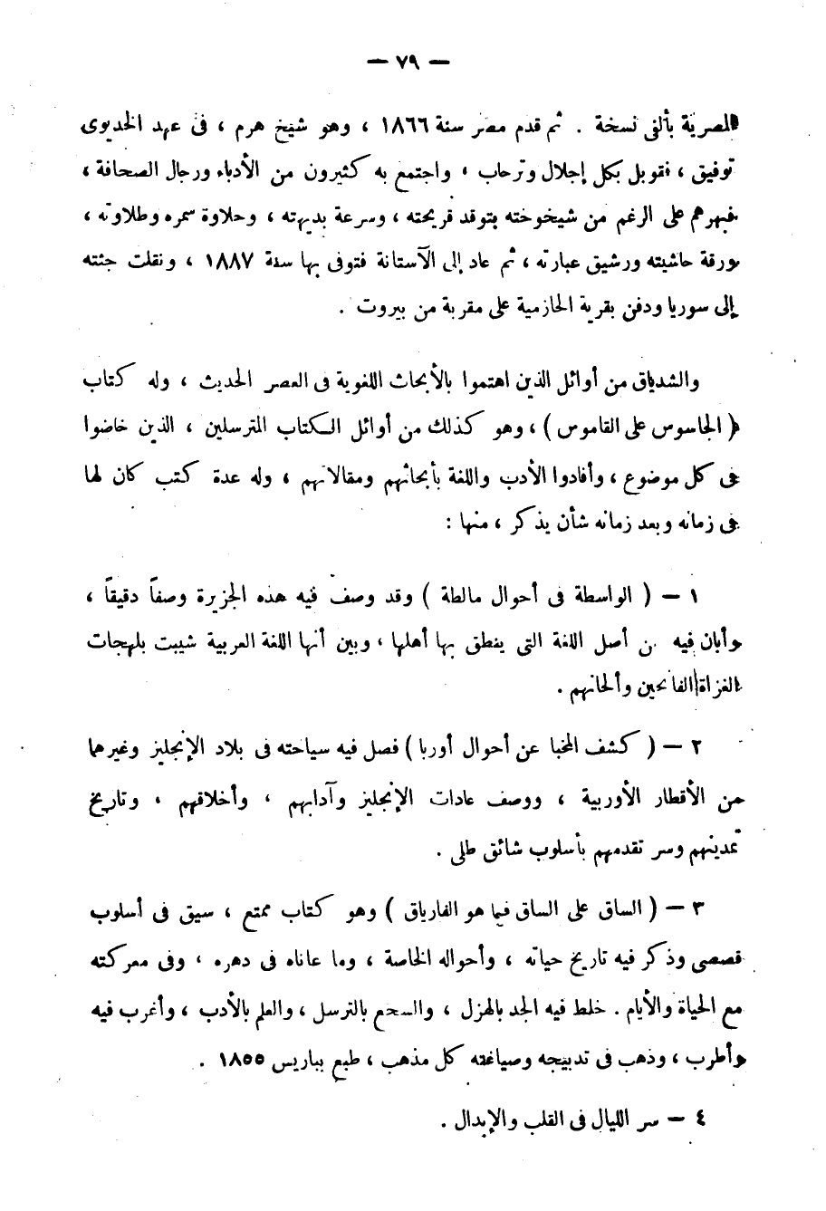 8- لأحمد فارس كتب مدرسية كثيرة منها: الباكورة الشهية في نحو اللغة الإنجليزية، والسند الراوي في الصرف الفرنساوي، واللفيف في كل معنى طريف.