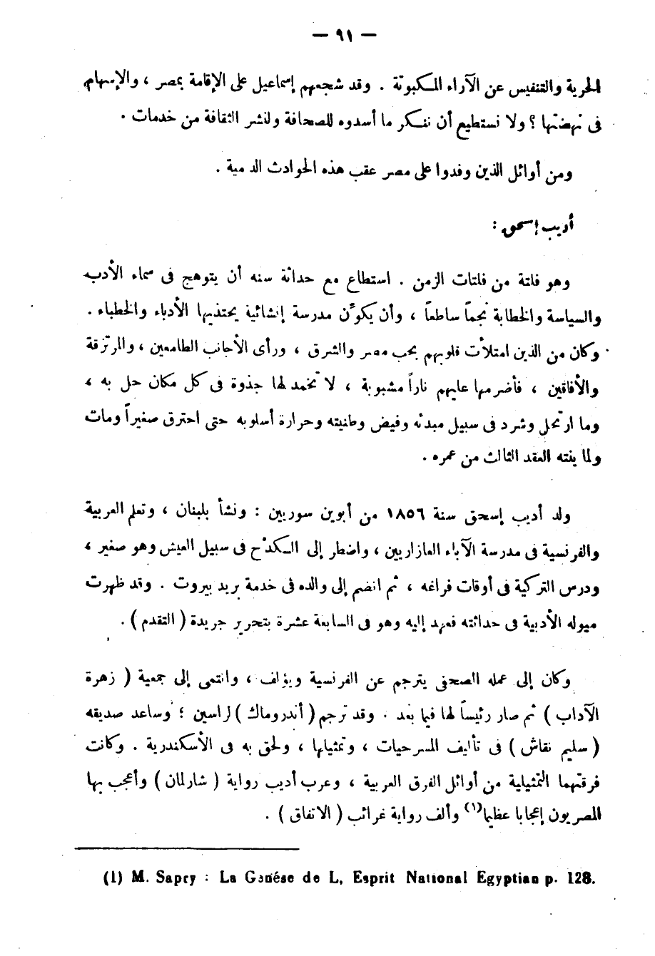 وحين تغيرت الأحوال في مصر, دُعِيَ إليها، وعُيِّنَ مديرًا لقلم الإنشاء والترجمة بوزارة المعارف، وسُمِحَ لجريدة مصر بالظهور، وشغل وظيفةً أخرى بجانب وظيفته الأولى؛ حيث عُيِّنَ كاتب سر مجلس شورى القوانين، وحين قامت الثورة العرابية واشتد لظاها, عاد إلى بيروت, ثم رجع إلى الإسكندرية، ثم اشتد به مرض الصدر، فعاد إلى لبنان؛ حيث مات بقرية الحدث بالقرب من بيروت, وهو في التاسعة والعشرين من عمره سنة 1885, وهي قريبة من القرية التي دفن فيها أحمد فارس الشدياق، وهكذا جمع الموت بين علمين من أعلام النهضة الحديثة, ورواد الفكر والأدب الجديد.
