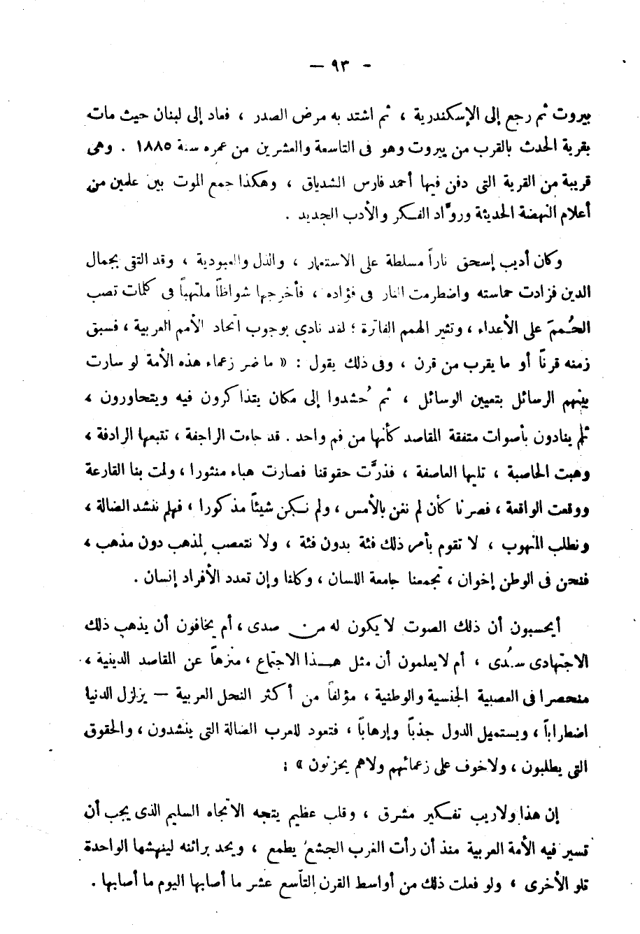 واستمع إليه يقول في الحزب الوطنيّ وأمانيه وأنه "يريد أن يكون المصريّ في مقام الإنسان، مستقلًّا بوجوده متمتعًا باستقلاله، فائزًا بحقوقه، نهاضًا بواجباته، وتريدونه بمنزلة الحيوان، يساق للموت، فإن عجز فللسلخ، ويطلب أن يكون الوطنيّ آمنًا في دراه، مساويًا لجاره، ويستغل زرعه، ويستدر ضرعه، وتلتمسون أن يكون غريبًا في آله، مصادرًا بماله، يطعم من يحرمه، ويؤمِّنُ من يروعه، ويحفظ من يضيعه1".