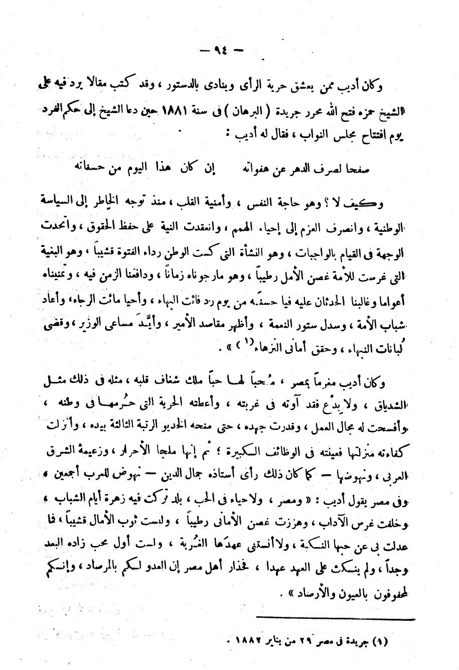 ولم يثنه تعطل جريدته ونزوحه إلى باريس عن غايته المثلى، وهي العمل على إيقاظ الشرق العربيّ، والدعوة للحرية، وطرد الأجانب من البلاد، وقد أعلن خطة جريدته "القاهرة" التي أصدرها بباريس, بقوله: "إني لا أقصد إلى الانتقام، وإنما أروم مقاومة الباطل ونصرة الحق، والمدافعة عن الشرق وآله، وعن الفضل ورجاله، فمَسْلَكِي أن أكشف حقائق الأمور، ملتزمًا جانب التصريح، متجافيًا عن التعريض والتلميح، وأن أجلو مبادئ الحرية، وآراء ذوي النقد، ومقصدي أن أثير بقية الحمية الشرقية، وأهيج فضالة الدم العربيّ، وأرفع الغشاوة عن أعين الساذجين، وأحيي الغيرة في قلوب العارفين، ليعلم قومي أن لهم حقًّا مسلوبًا فيلتمسوه، ومالًا منهوبًا فيطلبوه، وليخرجوا من خطة الخسف، وينبذوا عنهم كل مدلس يشتري بحقوقهم ثمنًا قليلًا، ويذيقوا الخائنين عذابًا وبيلًا، وليستصغروا الأنفس والنفائس في جنب حقوقهم، وليستميتوا في مجاهدة الذين يبيعون أبدانهم وأموالهم وأوطانهم وآلهم".