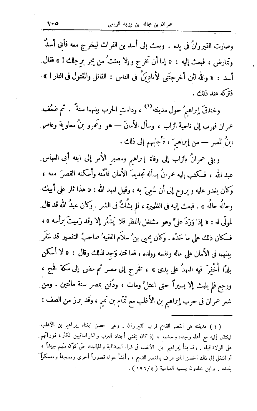 وَهُوَ الَّذِي بنى جَامع القيروان بالصخر والآجر والرخام بعد أَن هَدمه وَبنى الْمِحْرَاب كُله بالرخام من أَسْفَله إِلَى أَعْلَاهُ وَهُوَ منقوش بِكِتَاب وَغَيره كتاب ويستدير بِهِ سوار حسان بَعْضهَا مجزعة بأسود ناصعة الْبيَاض شَدِيدَة السوَاد ويقابل الْمِحْرَاب عمودان أَحْمَرَانِ فيهمَا توشيه بحمرة صَافِيَة