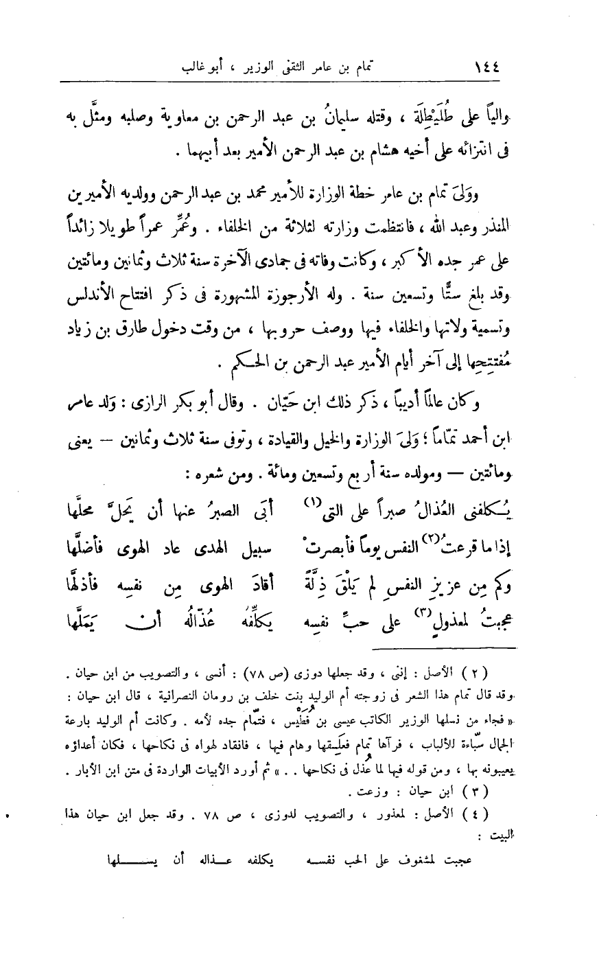 قَالَ وَكَانَ قد قيد كثيرا من أَنْسَاب أهل بَلَده وكلف أهل كور الأندلس أَن يلْحقُوا كل عَرَبِيّ أخمل ذكره قبل ولَايَته وَأَن يصحح
