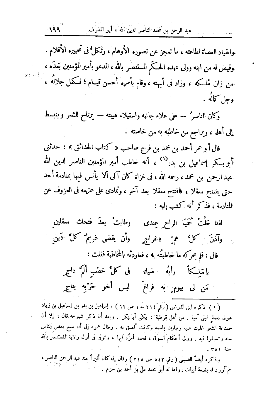 وَكَانَ قد أدب الحكم وَذَلِكَ أزلف جعفراً عِنْده وَأَدْنَاهُ مِنْهُ فاستخدمه بِالْكِتَابَةِ فِي إمارته وَولى جَزِيرَة ميورقة فِي أَيَّام النَّاصِر ثمَّ تقلد الحكم