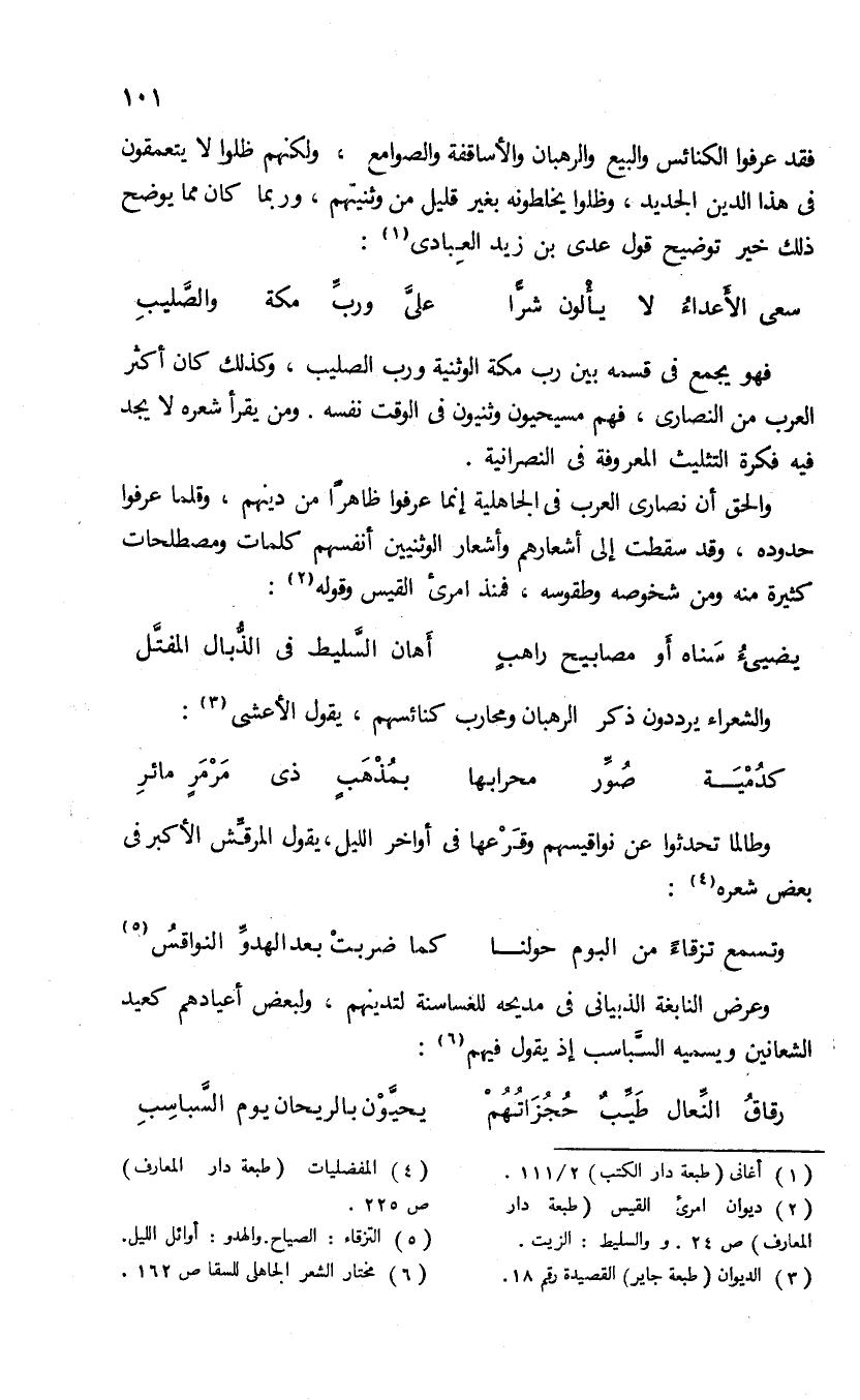 والحق أن نصارى العرب فى الجاهلية إنما عرفوا ظاهرا من دينهم، وقلما عرفوا حدوده، وقد سقطت إلى أشعارهم وأشعار الوثنيين أنفسهم كلمات ومصطلحات كثيرة منه ومن شخوصه وطقوسه، فمنذ امرئ القيس وقوله (¬2):
