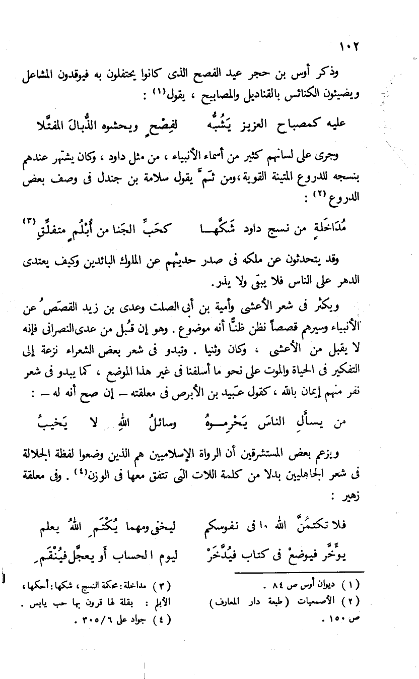 ويكثر فى شعر الأعشى وأمية بن أبى الصلت وعدى بن زيد القصص عن الأنبياء وسيرهم قصصا نظن ظنا أنه موضوع. وهو إن قبل من عدى النصرانى فإنه لا يقبل من أمية والأعشى، وكانا وثنيين. وتبدو فى شعر بعض الشعراء نزعة إلى التفكير فى الحياة والموت على نحو ما أسلفنا فى غير هذا الموضع، كما يبدو فى شعر نفر منهم إيمان بالله، كقول عبيد بن الأبرص فى معلقته-إن صح أنه له-: