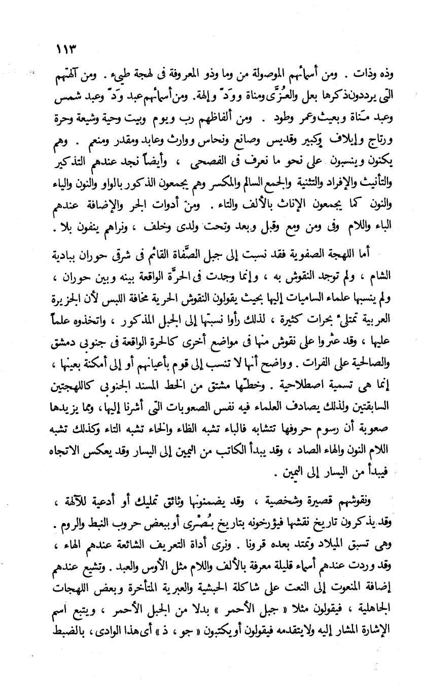 وذه وذات. ومن أسمائهم الموصولة من وما وذو المعروفة فى لهجة طيئ. ومن آلهتهم التى يرددون ذكرها بعل والعزّى ومناة وودّ وإلهة. ومن أسمائهم عبد ودّ وعبد شمس وعبد مناة وبعيث وعمر وطود. ومن ألفاظهم رب ويوم وبيت وحية وشيعة وحرة ورتاج وإيلاف وكبير وقديس وصانع ونحاس ووارث وعابد ومقدر ومنعم. وهم يكنون وينسبون على نحو ما نعرف فى الفصحى، وأيضا نجد عندهم التذكير والتأنيث والإفراد والتثنية والجمع السالم والمكسر وهم يجمعون الذكور بالواو والنون والياء والنون كما يجمعون الإناث بالألف والتاء. ومن أدوات الجر والإضافة عندهم الباء واللام وفى ومن ومع وقبل وبعد وتحت ولدى وخلف، ونراهم ينفون بلا.