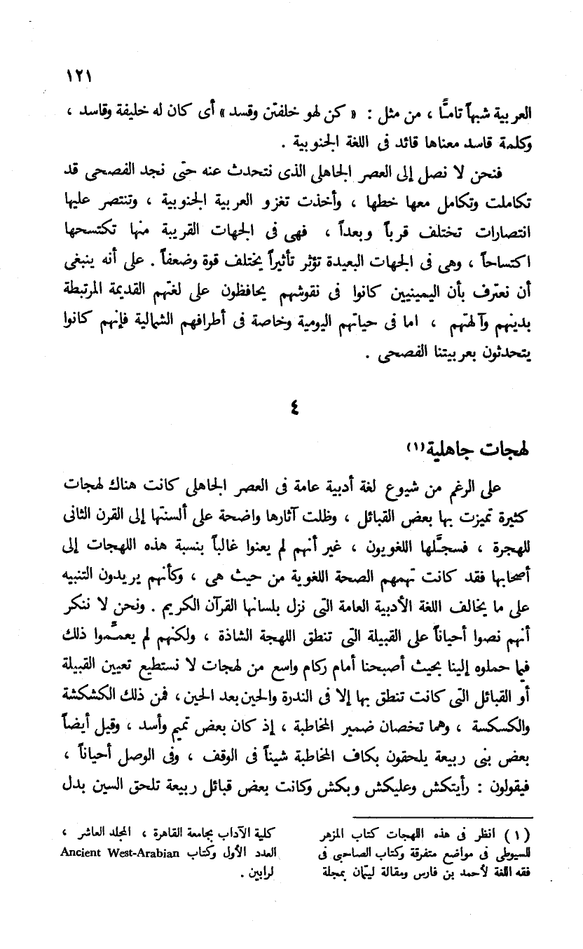 (¬1) انظر فى هذه اللهجات كتاب المزهر للسيوطى فى مواضع متفرقة وكتاب الصاحبى فى فقه اللغة لأحمد بن فارس ومعالم البيان مجلة كلية الآداب بجامعة القاهرة، المجلد العاشر، العدد الأول وكتاب Ancient West-Arabian لرابين.
