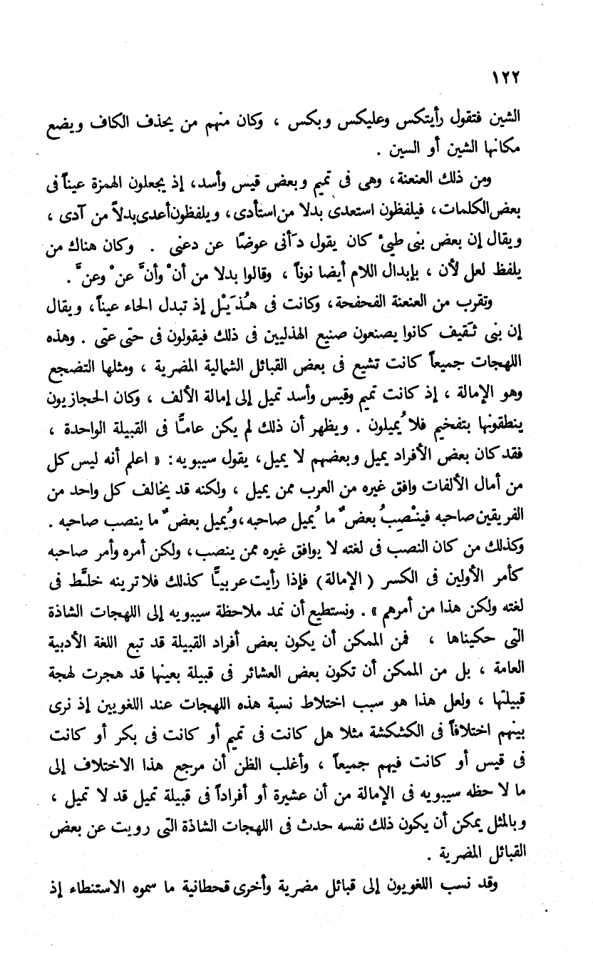 وكذلك من كان النصب فى لغته لا يوافق غيره ممن ينصب، ولكن أمره وأمر صاحبه كأمر الأولين فى الكسر (الإمالة) فإذا رأيت عربيّا كذلك فلا ترينه خلّط فى لغته ولكن هذا من أمرهم». ونستطيع أن نمد ملاحظة سيبويه إلى اللهجات الشاذة التى حكيناها، فمن الممكن أن يكون بعض أفراد القبيلة قد تبع اللغة الأدبية العامة، بل من الممكن أن تكون بعض العشائر فى قبيلة بعينها قد هجرت لهجة قبيلتها، ولعل هذا هو سبب اختلاط نسبة هذه اللهجات عند اللغويين إذ نرى بينهم اختلافا فى الكشكشة مثلا هل كانت فى تميم أو كانت فى بكر أو كانت فى قيس أو كانت فيهم جميعا، وأغلب الظن أن مرجع هذا الاختلاف إلى ما لا حظه سيبويه فى الإمالة من أن عشيرة أو أفرادا فى قبيلة تميل قد لا تميل، وبالمثل يمكن أن يكون ذلك نفسه حدث فى اللهجات الشاذة التى رويت عن بعض القبائل المضرية.