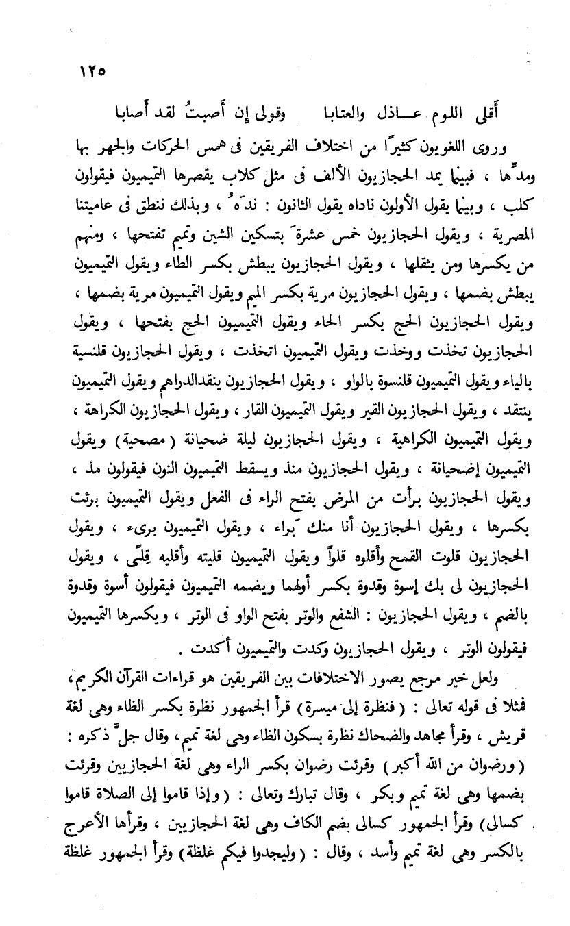ولعل خير مرجع يصور الاختلافات بين الفريقين هو قراءات القرآن الكريم، فمثلا فى قوله تعالى: {(فَنَظِرَةٌ إِلى مَيْسَرَةٍ)} قرأ الجمهور نظرة بكسر الظاء وهى لغة قريش، وقرأ مجاهد والضحاك نظرة بسكون الظاء وهى لغة تميم، وقال جلّ ذكره: