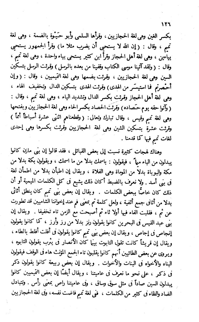 بكسر الغين وهى لغة الحجازيين، وقرأها السلمى وأبو حيوة بالضمة، وهى لغة تميم، وقال: {(إِنَّ اللهَ لا يَسْتَحْيِي أَنْ يَضْرِبَ مَثَلاً ما)} وقرأ الجمهور يستحيى بياءين، وهى لغة أهل الحجاز وقرأ ابن كثير يستحيى بياء واحدة، وهى لغة تميم، وقال: {(وَلَقَدْ آتَيْنا مُوسَى الْكِتابَ وَقَفَّيْنا مِنْ بَعْدِهِ بِالرُّسُلِ)} وقرئت الرسل بتسكين السين وهى لغة الحجازيين، وقرئت بضمها وهى لغة التميميين، وقال: {(فَإِنْ أُحْصِرْتُمْ فَمَا اِسْتَيْسَرَ مِنَ الْهَدْيِ)} وقرئت الهدى بتسكين الدال وتخفيف الهاء، وهى لغة أهل الحجاز وقرئت بكسر الدال وتشديد الياء، وهى لغة تميم، وقال: