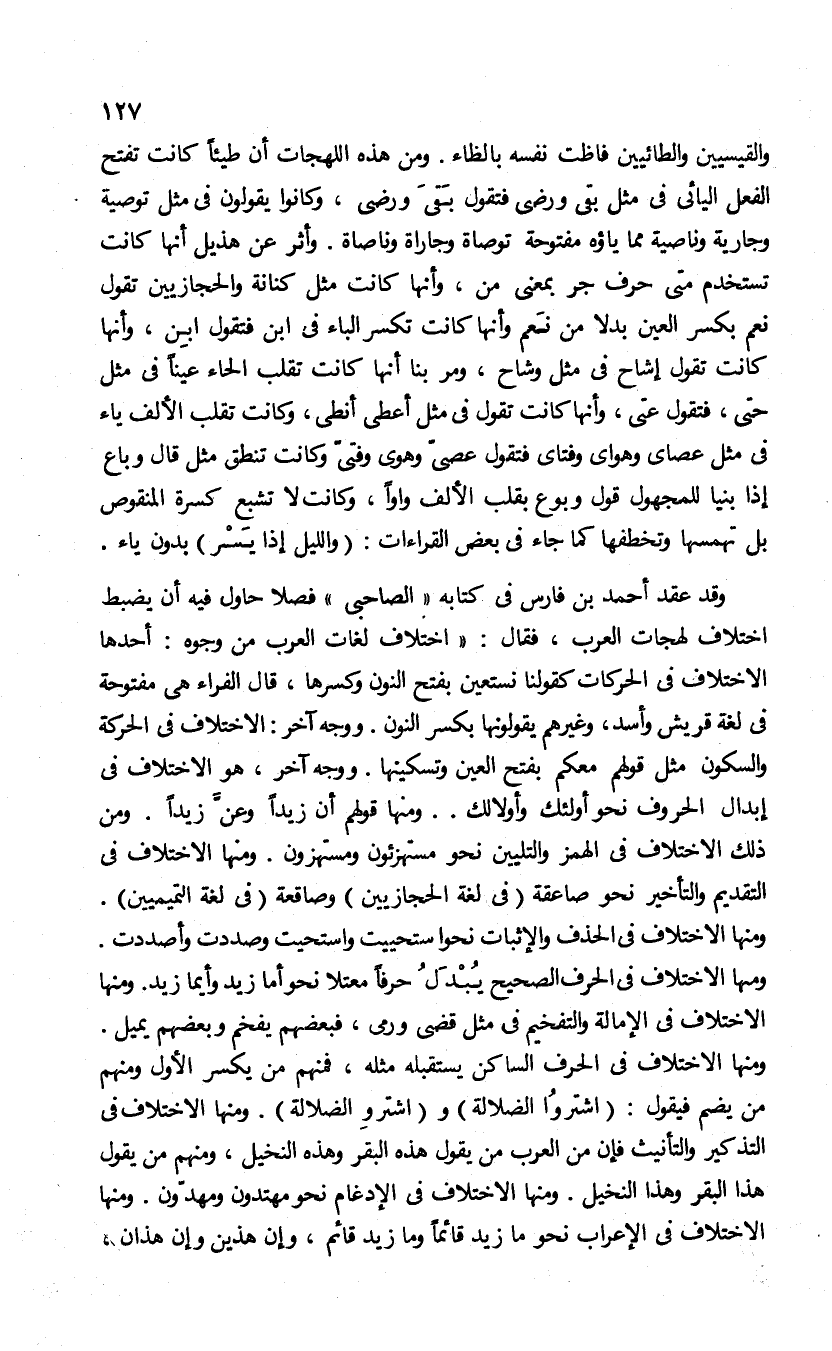 وقد عقد أحمد بن فارس فى كتابه «الصاحبى» فصلا حاول فيه أن يضبط اختلاف لهجات العرب، فقال: «اختلاف لغات العرب من وجوه: أحدها الاختلاف فى الحركات كقولنا نستعين بفتح النون وكسرها، قال الفراء هى مفتوحة فى لغة قريش وأسد، وغيرهم يقولونها بكسر النون. ووجه آخر: الاختلاف فى الحركة والسكون مثل قولهم معكم بفتح العين وتسكينها. ووجه آخر، هو الاختلاف فى إبدال الحروف نحو أولئك وأولالك. . ومنها قولهم أن زيدا وعنّ زيدا. ومن ذلك الاختلاف فى الهمز والتليين نحو مستهزئون ومستهزون. ومنها الاختلاف فى التقديم والتأخير نحو صاعقة (فى لغة الحجازيين) وصاقعة (فى لغة التميميين).