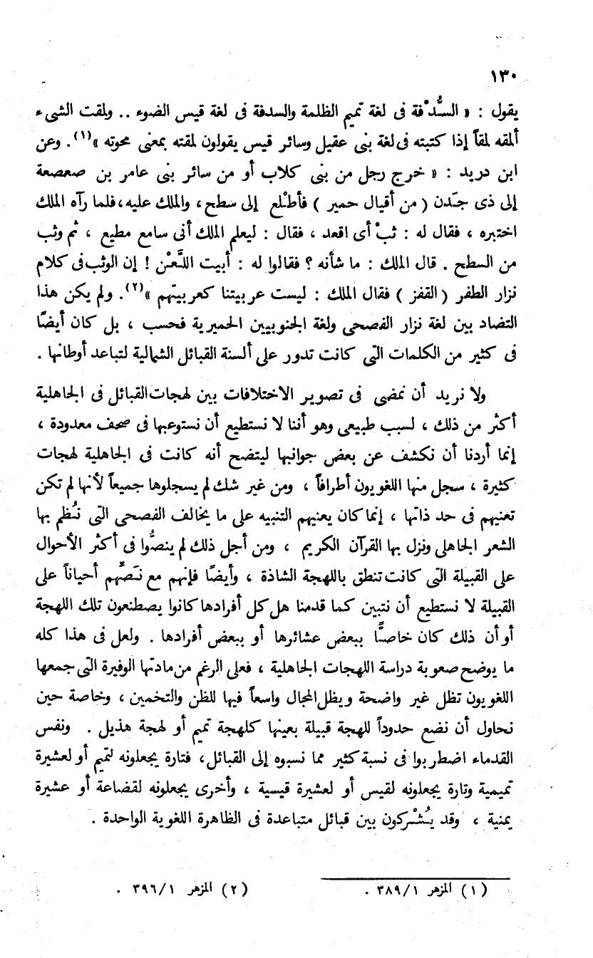 ولا نريد أن نمضى فى تصوير الاختلافات بين لهجات القبائل فى الجاهلية، أكثر من ذلك، لسبب طبيعى وهو أننا لا نستطيع أن نستوعبها فى صحف معدودة، إنما أردنا أن نكشف عن بعض جوانبها ليتضح أنه كانت فى الجاهلية لهجات كثيرة، سجل منها اللغويون أطرافا، ومن غير شك لم يسجلوها جميعا لأنها لم تكن تعنيهم فى حد ذاتها، إنما كان يعنيهم التنبيه على ما يخالف الفصحى التى نظم بها الشعر الجاهلى ونزل بها القرآن الشريف، ومن أجل ذلك لم ينصّوا فى أكثر الأحوال على القبيلة التى كانت تنطق باللهجة الشاذة، وأيضا فإنهم مع نصهم أحيانا على القبيلة لا نستطيع أن نتبين كما قدمنا هل كل أفرادها كانوا يصطنعون تلك اللهجة أو أن ذلك كان خاصا ببعض عشائرها أو ببعض أفرادها. ولعل فى هذا كله ما يوضح صعوبة دراسة اللهجات الجاهلية، فعلى الرغم من مادتها الوفيرة التى جمعها اللغويون تظل غير واضحة ويظل المجال واسعا فيها للظن والتخمين، وخاصة حين نحاول أن نضع حدودا للهجة قبيلة بعينها كلهجة تميم أو لهجة هذيل. ونفس القدماء اضطربوا فى نسبة كثير مما نسبوه إلى القبائل، فتارة يجعلونه لتميم أو لعشيرة تميمية