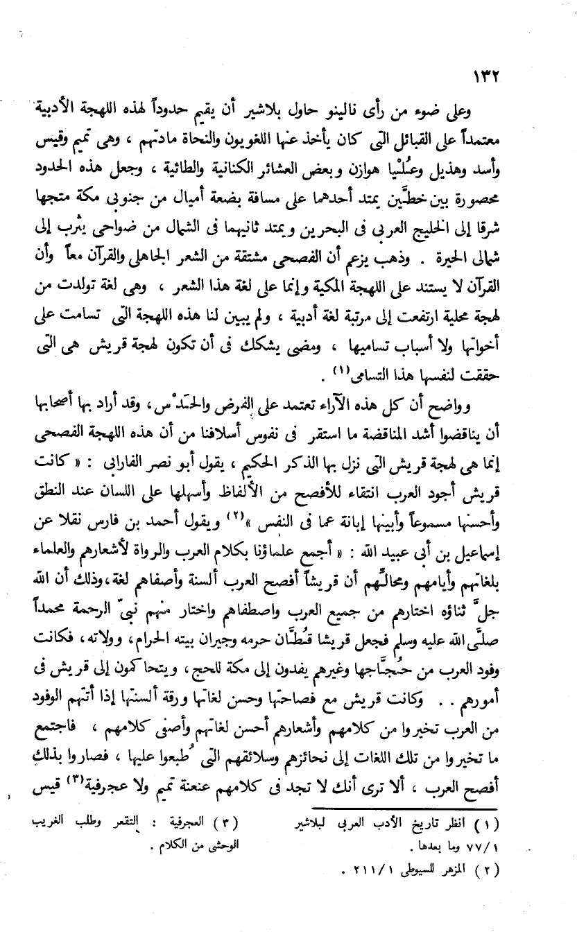وعلى ضوء من رأى نالينو حاول بلاشير أن يقيم حدودا لهذه اللهجة الأدبية معتمدا على القبائل التى كان يأخذ عنها اللغويون والنحاة مادتهم، وهى تميم وقيس وأسد وهذيل وعليا هوازن وبعض العشائر الكنانية والطائية، وجعل هذه الحدود محصورة بين خطين يمتد أحدهما على مسافة بضعة أميال من جنوبى مكة متجها شرقا إلى الخليج العربى فى البحرين ويمتد ثانيهما فى الشمال من ضواحى يثرب إلى شمالى الحيرة. وذهب يزعم أن الفصحى مشتقة من الشعر الجاهلى والقرآن معا وأن القرآن لا يستند على اللهجة المكية وإنما على لغة هذا الشعر، وهى لغة تولدت من لهجة محلية ارتفعت إلى مرتبة لغة أدبية. ولم يبين لنا هذه اللهجة التى تسامت على أخواتها ولا أسباب هذا التسامى، ومضى يشكك فى أن تكون لهجة قريش هى التى حققت لنفسها هذا التسامى (¬2).
