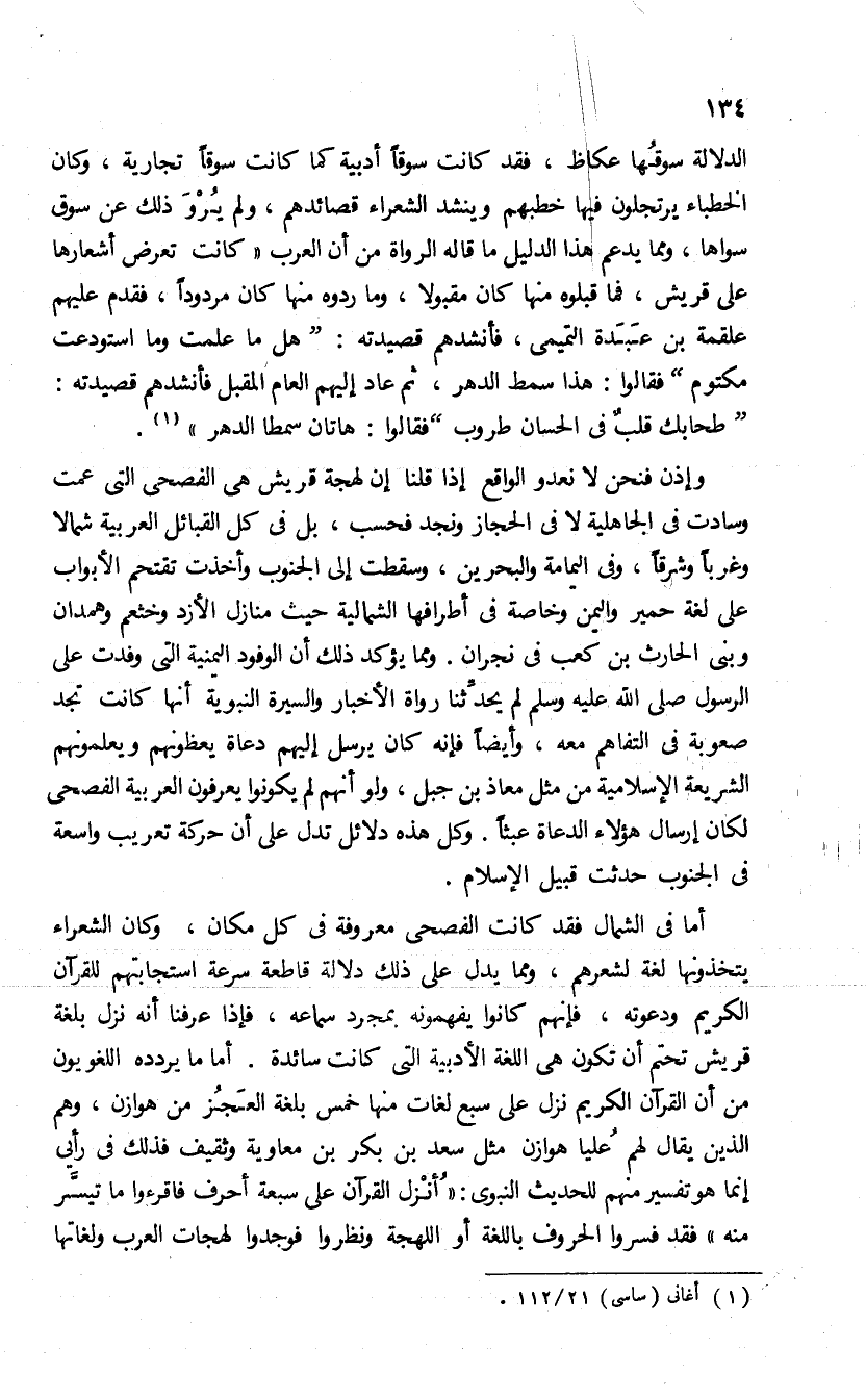 وإذن فنحن لا نعدو الواقع أإذا قلنا إن لهجة قريش هى الفصحى التى عمت وسادت فى الجاهلية لا فى الحجاز ونجد فحسب، بل فى كل القبائل العربية شمالا وغربا وشرقا، وفى اليمامة والبحرين. وسقطت إلى الجنوب وأخذت تقتحم الأبواب على لغة حمير واليمن وخاصة فى أطرافها الشمالية حيث منازل الأزد وخثعم وهمدان وبنى الحارث بن كعب فى نجران. ومما بؤكد ذلك أن الوفود اليمنية التى وفدت على الرسول صلى الله عليه وسلم لم يحدّثنا رواة الأخبار والسيرة النبوية أنها كانت تجد صعوبة فى التفاهم معه، وأيضا فإنه كان يرسل إليهم دعاة يعظونهم ويعلمونهم الشريعة الإسلامية من مثل معاذ بن جبل، ولو أنهم لم يكونوا يعرفون العربية الفصحى لكان إرسال هؤلاء الدعاة عبثا. وكل هذه دلائل تدل على أن حركة تعريب واسعة فى الجنوب حدثت قبيل الإسلام.