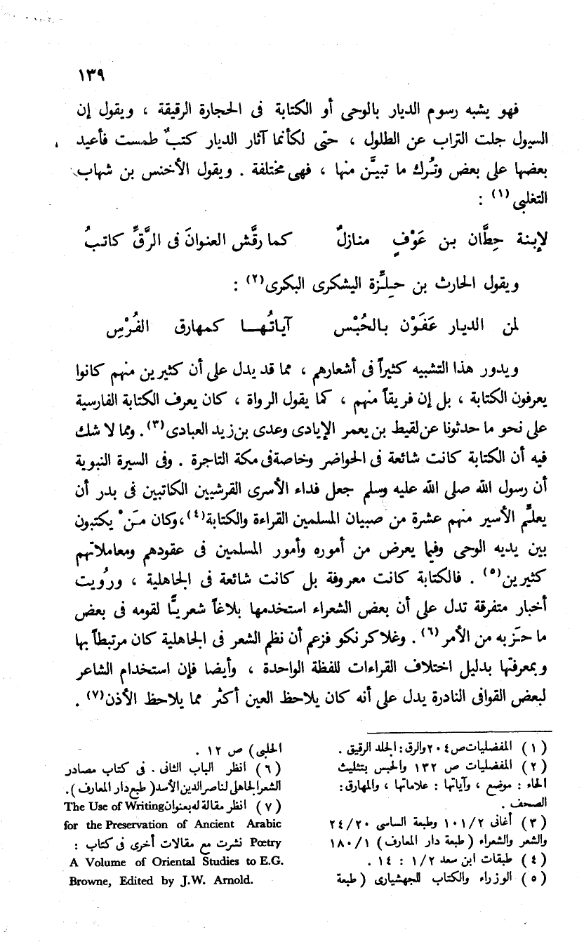 (¬7) انظر مقالة له بعنوان for the Preservation of Ancient Arabic Poetry The Use of Writing نشرت مع مقالات أخرى فى كتاب to E .G .Browne,Edited by J .W .Arnold . A Volume of Oriental Studies: