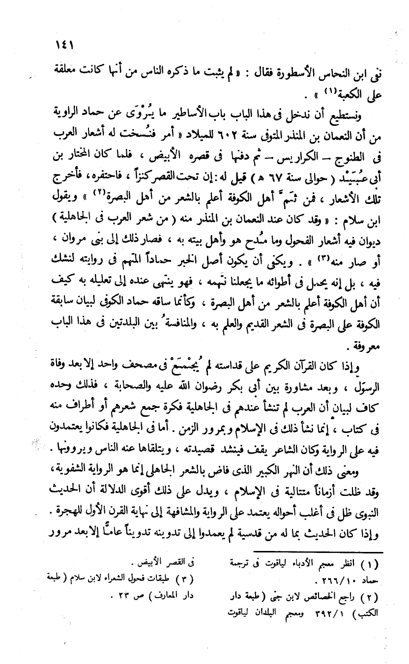 ونستطيع أن ندخل فى هذا الباب باب الأساطير ما يروى عن حماد الراوية من أن النعمان بن المنذر المتوفى سنة 602 للميلاد «أمر فنسخت له أشعار العرب فى الطنوج-الكراريس-ثم دفنها فى قصره الأبيض، فلما كان المختار بن أبى عبيد (حوالى سنة 67 هـ) قيل له: إن تحت القصر كنزا، فاحتفره، فأخرج تلك الأشعار، فمن ثم أهل الكوفة أعلم بالشعر من أهل البصرة (¬2)» ويقول ابن سلام: «وقد كان عند النعمان بن المنذر منه (من شعر العرب فى الجاهلية) ديوان فيه أشعار الفحول وما مدح هو وأهل بيته به، فصار ذلك لى بنى مروان، أو صار منه (¬3)». ويكفى أن يكون أصل الخبر حمادا المتهم فى روايته لنشك فيه، بل إنه يحمل فى أطوائه ما يجعلنا نتهمه، فهو ينتهى عنده إلى تعليله به كيف أن أهل الكوفة أعلم بالشعر من أهل البصرة، وكأنما ساقه حماد الكوفى لبيان سابقة الكوفة على البصرة فى الشعر القديم والعلم به، والمنافسة بين البلدتين فى هذا الباب معروفة.