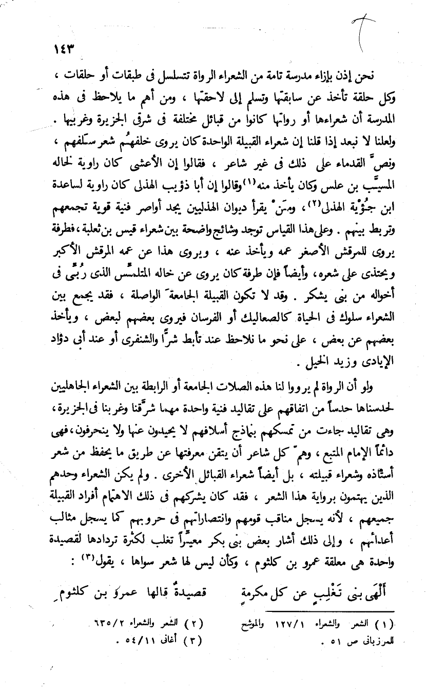 نحن إذن بإزاء مدرسة تامة من الشعراء الرواة تتسلسل فى طبقات أو حلقات، وكل حلقة تأخذ عن سابقتها وتسلم إلى لاحقتها، ومن أهم ما يلاحظ فى هذه المدرسة أن شعراءها أو رواتها كانوا من قبائل مختلفة فى شرقى الجزيرة وغربيها، ولعلنا لا نبعد إذا قلنا إن شعراء القبيلة الواحدة كان يروى خلفهم شعر سلفهم، ونصّ القدماء على ذلك فى غير شاعر، فقالوا إن الأعشى كان رواية لخاله المسيّب بن علس وكان يأخذ منه (¬1) وقالوا إن أبا ذؤيب الهذلى كان راوية لساعدة بن جؤية الهذلى (¬2)، ومن يقرأ ديوان الهذليين يجد أواصر فنية قوية تجمعهم وتربط بينهم. وعلى هذا القياس توجد وشائج واضحة بين شعراء قيس بن ثعلبة، فطرفة يروى للمرقش الأصغر عمه ويأخذ عنه، ويروى هذا عن عمه المرقش الأكبر ويحتذى على شعره. وأيضا فإن طرفة كان يروى عن خاله المتلمّس الذى ربى فى أخواله من بنى يشكر. وقد لا تكون القبيلة الجامعة الواصلة، فقد يجمع بين الشعراء سلوك فى الحياة كالصعاليك أو الفرسان فيروى بعضهم لبعض، ويأخذ بعضهم عن بعض، على نحو ما نلاحظ عند تأبط شرا والشنفرى أو عند أبى دؤاد الإيادى وزيد الخيل.