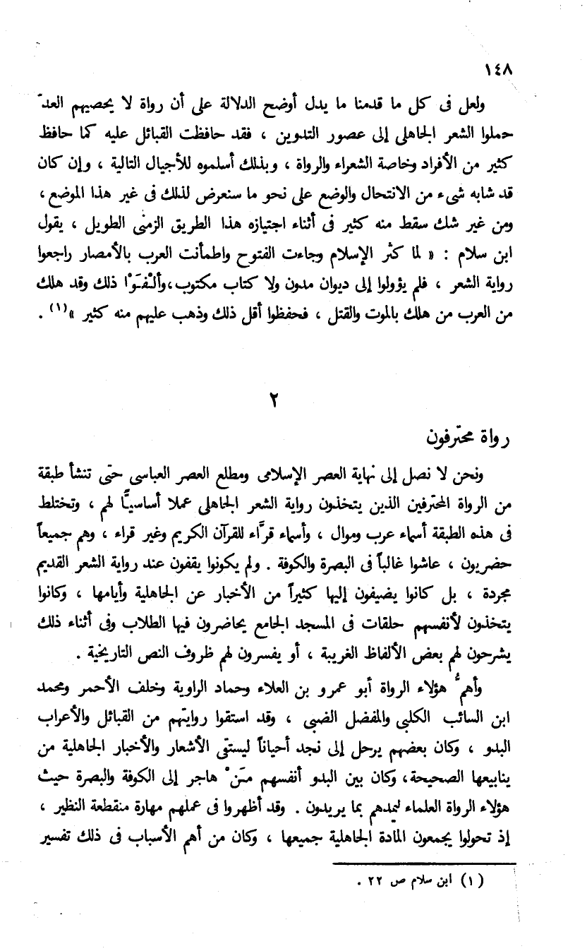 ونحن لا نصل إلى نهاية العصر الإسلامى ومطلع العصر العباسى حتى تنشأ طبقة من الرواة المحترفين الذين يتخذون رواية الشعر الجاهلى عملا أساسيا لهم، وتختلط فى هذه الطبقة أسماء عرب وموال، وأسماء قرّاء للقرآن الكريم وغير قراء، وهم جميعا حضريون، عاشوا غالبا فى البصرة والكوفة. ولم يكونوا يقفون عند رواية الشعر القديم مجردة، بل كانوا يضيفون إليها كثيرا من الأخبار عن الجاهلية وأيامها، وكانوا يتخذون لأنفسهم حلقات فى المسجد الجامع يحاضرون فيها الطلاب وفى أثناء ذلك يشرحون لهم بعض الألفاظ الغريبة، أو يفسرون لهم ظروف النص التاريخية.