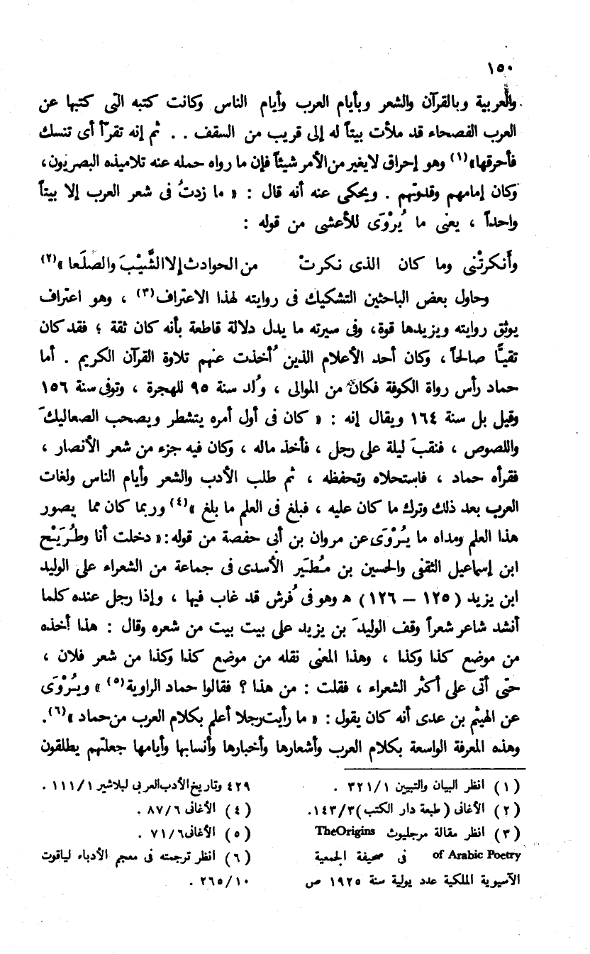 وحاول بعض الباحثين التشكيك فى روايته لهذا الاعتراف (¬3)، وهو اعتراف يوتق روايته ويزيدها قوة، وفى سيرته ما يدل دلالة قاطعة بأنه كان ثقة؛ فقد كان تقيا صالحا، وكان أحد الأعلام الذين أخذت عنهم تلاوة القرآن الكريم. أما حماد رأس رواة الكوفة فكان من الموالى، ولد سنة 95 للهجرة، وتوفى سنة 156 وقيل بل سنة 164 ويقال إنه: «كان فى أول أمره يتشطر ويصحب الصعاليك واللصوص، فنقب ليلة على رجل، فأخذ ماله، وكان فيه جزء من شعر الأنصار، فقرأه حماد، فاستحلاه وتحفظه، ثم طلب الأدب والشعر وأيام الناس ولغات العرب بعد ذلك وترك ما كان عليه، فبلغ فى العلم ما بلغ (¬4)» وربما كان مما يصور هذا العلم ومداه ما يروى عن مروان بن أبى حفصة من قوله: «دخلت أنا وطريح بن إسماعيل الثقفى والحسين بن مطير الأسدى فى جماعة من الشعراء على الوليد ابن يزيد (125 - 126 هـ) وهو فى فرش قد غاب فيها، وإذا رجل عنده كلما أنشد شاعر شعرا وقف الوليد بن يزيد على بيت بيت من شعره وقال: هذا أخذه من موضع كذا وكذا، وهذا المعنى نقله من موضع كذا وكذا من شعر فلان، حتى أتى على أكثر الشعراء، فقلت: من هذا؟ فقالوا حماد الراوية (¬5)» ويروى عن الهيثم بن عدى أنه كان يقول: «ما رأيت رجلا أعلم بكلام العرب من حماد (¬6)» وهذه المعرفة الواسعة بكلام العرب وأشعارها وأخبارها وأنسابها وأيامها جعلتهم يطلقون