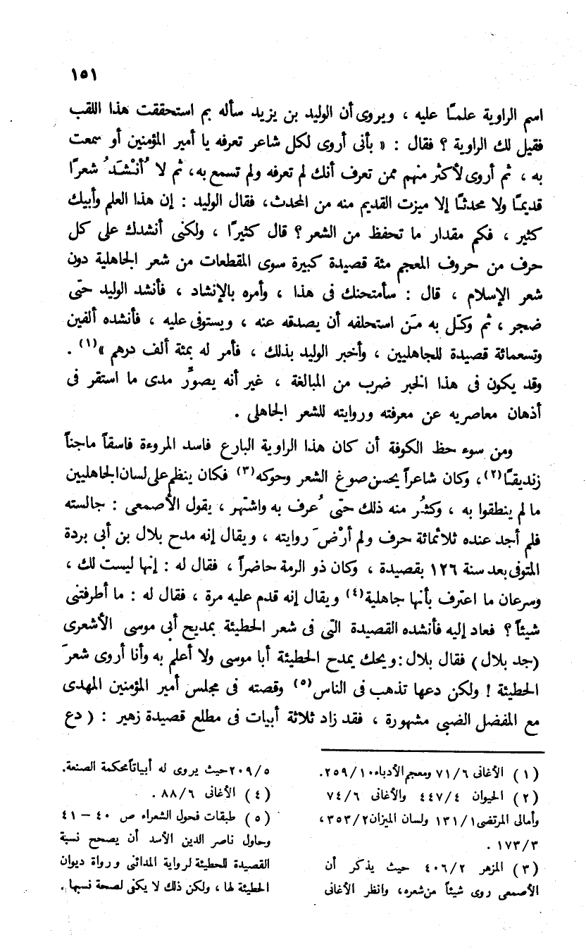 ومن سوء حظ الكوفة أن كان هذا الراوية البارع فاسد المروءة فاسقا ماجنا زنديقا (¬2)، وكان شاعرا يحسن صوغ الشعر وحوكه (¬3) فكان ينظم على لسان الجاهليين ما لم ينطقوا به، وكثر منه ذلك حتى عرف به واشتهر، يقول الأصمعى: جالسته فلم أجد عنده ثلاثمائة حرف ولم أرض روايته، ويقال إنه مدح بلال بن أبى بردة المتوفى بعد سنة 126 بقصيدة، وكان ذو الرمة حاضرا، فقال له: إنها ليست لك، وسرعان ما اعترف بأنها جاهلية (¬4) ويقال إنه قدم عليه مرة، فقال له: ما أطرفتنى شيئا؟ فعاد إليه فأنشده القصيدة التى فى شعر الحطيئة بمديح أبى موسى الأشعرى (جد بلال) فقال بلال: ويحك يمدح الحطيئة أبا موسى ولا أعلم به وأنا أروى شعر الحطيئة! ولكن دعها تذهب فى الناس (¬5)، وقصته فى مجلس أمير المؤمنين المهدى مع المفضل الضبى مشهورة، فقد زاد ثلاثة أبيات فى مطلع قصيدة زهير: (دع ذا وعد القول فى هرم) فأنكرها المفضل ولما سأله عنها المهدى بكل يمين محرجة
