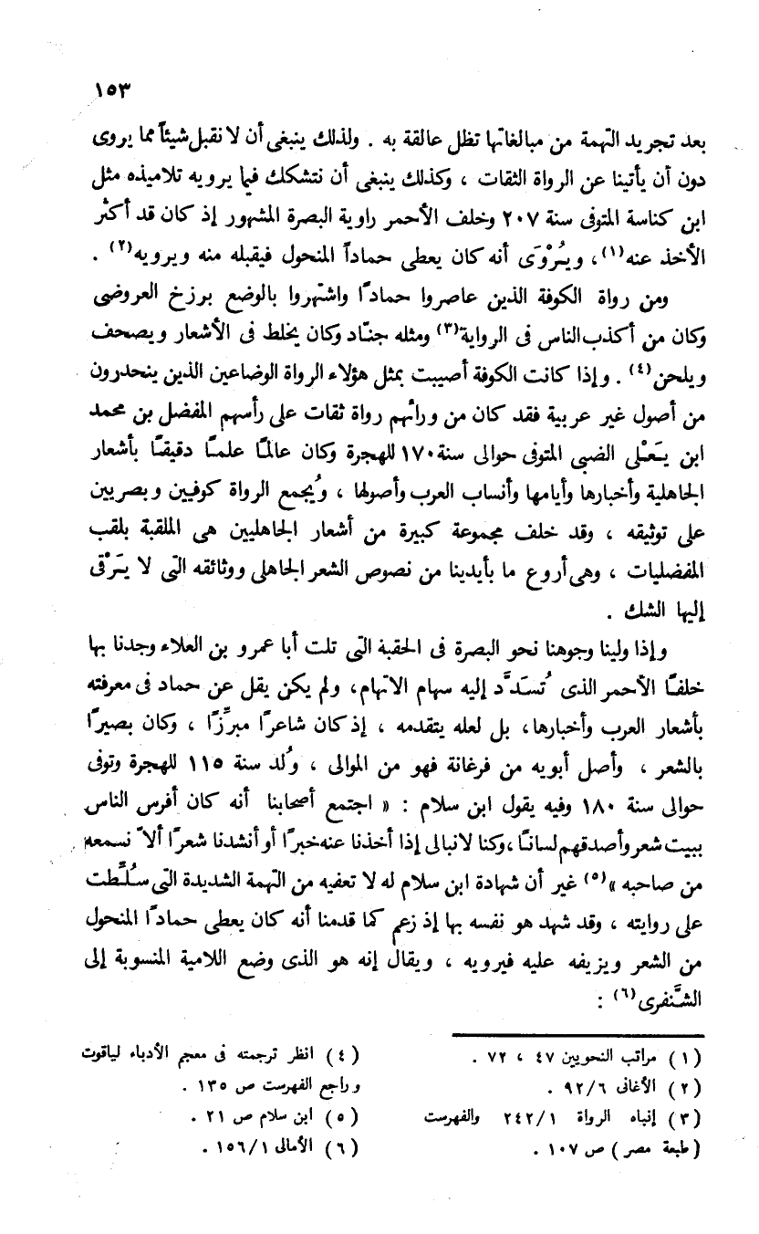 ومن رواة الكوفة الذين عاصروا حمادا واشتهروا بالوضع برزخ العروضى وكان من أكذب الناس فى الرواية (¬3) ومثله جنّاد وكان يخلط فى الأشعار ويصحف ويلحن (¬4). وإذا كانت الكوفة أصيبت بمثل هؤلاء الرواة الوضاعين الذين ينحدرون من أصول غير عربية فقد كان من ورائهم رواة ثقات على رأسهم المفضل بن محمد ابن يعلى الضبى المتوفى حوالى سنة 170 للهجرة وكان عالما علما دقيقا بأشعار الجاهلية وأخبارها وأيامها وأنساب العرب وأصولها، ويجمع الرواة كوفيين وبصريين على توثيقه، وقد خلف مجموعة كبيرة من أشعار الجاهليين هى الملقبة بلقب المفضليات، وهى أروع ما بأيدينا من نصوص الشعر الجاهلى ووثائقه التى لا يرقى إليها الشك.