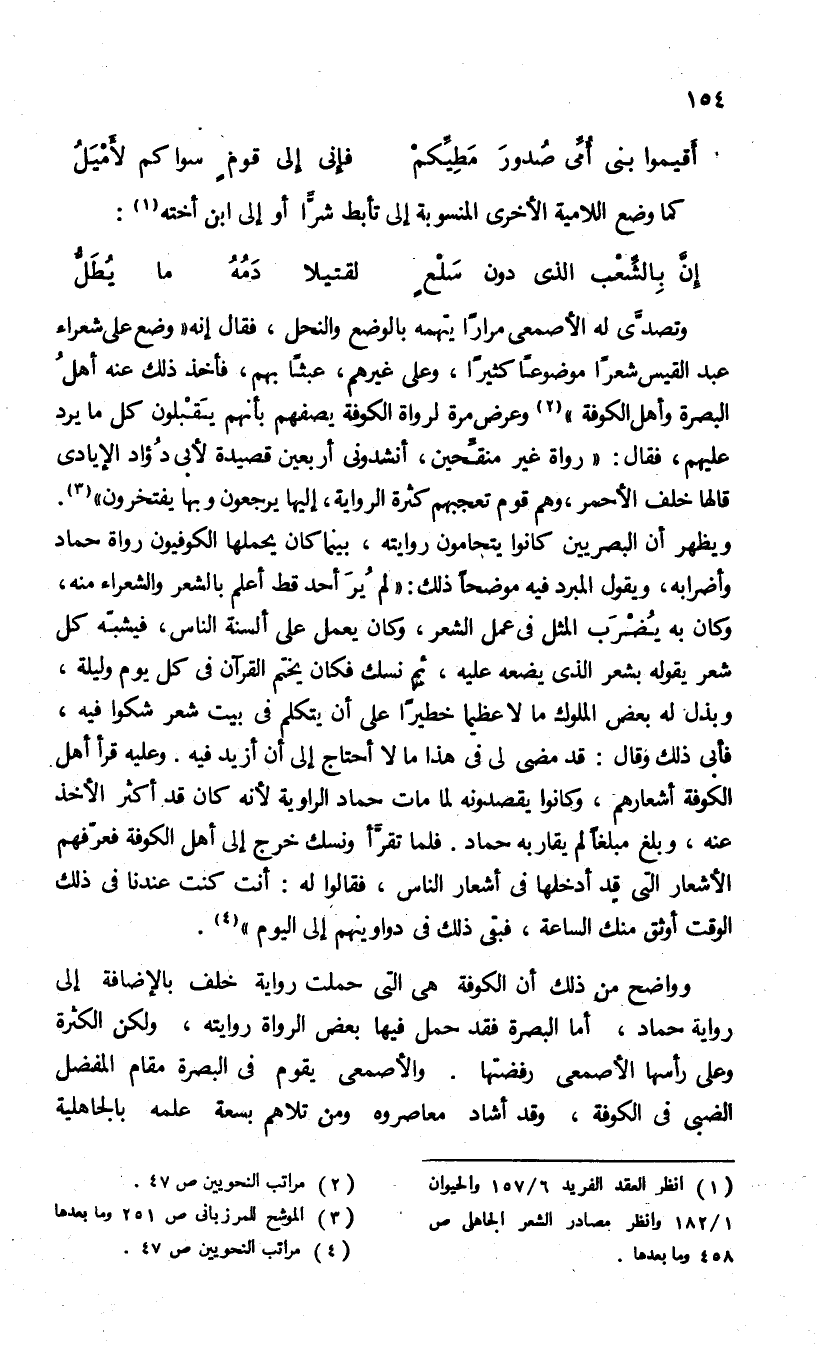 وتصدّى له الأصمعى مرارا يتهمه بالوضع والنحل، فقال إنه «وضع على شعراء عبد القيس شعرا موضوعا كثيرا، وعلى غيرهم، عبثا بهم، فأخذ ذلك عنه أهل البصرة وأهل الكوفة (¬2)» وعرض مرة لرواة الكوفة يصفهم بأنهم يقبلون كل ما يرد عليهم، فقال: «رواة غير منقّحين، أنشدونى أربعين قصيدة لأبى دؤاد الإيادى قالها خلف الأحمر، وهم قوم تعجبهم كثرة الرواية، إليها يرجعون وبها يفتخرون (¬3)».
