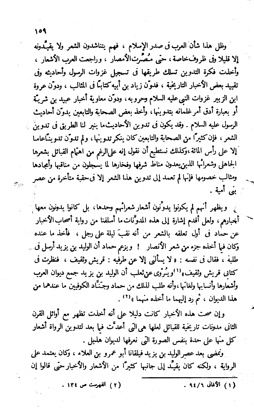 وظل هذا شأن العرب فى صدر الإسلام، فهم يتناشدون الشعر ولا يقيدونه إلا قليلا وفى ظروف خاصة، حتى مصّرت الأمصار، وراجعت العرب الأشعار، وأخذت فكرة التدوين تسلك طريقها فى تسجيل غزوات الرسول وأحاديثه وفى تقييد بعض الأخبار التاريخية، فدوّن زياد بن أبيه كتابا فى المثالب، ودوّن عروة ابن الزبير غزوات النبى عليه السلام وحروبه، ودوّن معاوية أخبار عبيد بن شريّة أو بعبارة أدق أمر غلمانه بتدوينها، وأخذ بعض الصحابة والتابعين يدوّن أحاديث الرسول عليه السلام. وقد يكون فى تدوين الأحاديث ما ينير لنا الطريق فى تدوين الشعر، فإن كثيرا من الصحابة والتابعين كان ينكر تدوينها، ولم تدوّن تدوينا عاما إلا على رأس المائة، وكذلك نستطيع أن نقول إنه على الرغم من اهتمام القبائل بشعرها الجاهلى وشعرائها الذين يعدون مناط شرفها وفخارها لما يسجلون من مناقبها وأمجادها ومثالب خصومها فإنها لم تعمد إلى تدوين هذا الشعر إلا فى حقبة متأخرة من عصر بنى أمية.