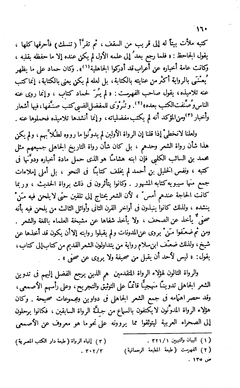 ولعلنا لا نخطئ إذا قلنا إن الرواة الأولين لم يدونوا ما رووه لطلاّبهم، ولم يكن هذا شأن رواة الشعر وحدهم، بل كان شأن رواة التاريخ الجاهلى جميعهم مثل محمد بن السائب الكلبى فإن ابنه هشاما هو الذى حمل مادة أخباره ودوّنها فى كتبه. ونفس الخليل بن أحمد لم يخلف كتابا فى النحو، بل أملى إملاءات جمع منها سيبوبه كتابه المشهور. وكانوا يتأثرون فى ذلك برواة الحديث، وربما كانت الحاجة عندهم أمسّ، لأن الشعر يحتاج إلى تلقين حتى لا يلحن فيه من ينشده، ولذلك كانوا ينبذون فى أواخر القرن الثانى وأوائل الثالث من يلحن فيه بأنه صحفى يأخذ عن الصحف، ولا يأخذ شفاها عن مشيخة العلماء باللغة والشعر.