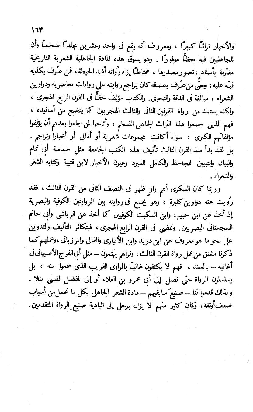 وربما كان السكرى أهم راو ظهر فى النصف الثانى من القرن الثالث، فقد رويت عنه دواوين كثيرة، وهو يجمع فى روايته بين الروايتين الكوفية والبصرية إذ أخذ عن ابن حبيب وابن السكيت الكوفيين كما أخذ عن الرياشى وأبى حاتم السجستانى البصريين. ونمضى فى القرن الرابع الهجرى، فيتكاثر التأليف والتدوين على نحو ما هو معروف عن ابن دريد وابن الأنبارى والقالى والمرزبانى، وعملهم كما ذكرنا مشتق من عمل رواة القرن الثالث، ونراهم يهتمون-مثل أبى الفرج الأصبهانى فى أغانيه-بالسند، فهم لا يكتفون غالبا بالراوى القريب الذى سمعوا منه، بل يسلسلون الرواة حتى نصل إلى أبى عمرو بن العلاء أو إلى المفضل الضبى مثلا. وبذلك قدموا لنا-صنيع سابقيهم-مادة الشعر الجاهلى بكل ما تحمل من أسباب ضعف أو ثقة، وكان كثير منهم لا يزال يرحل إلى البادية صنيع الرواة المتقدمين.