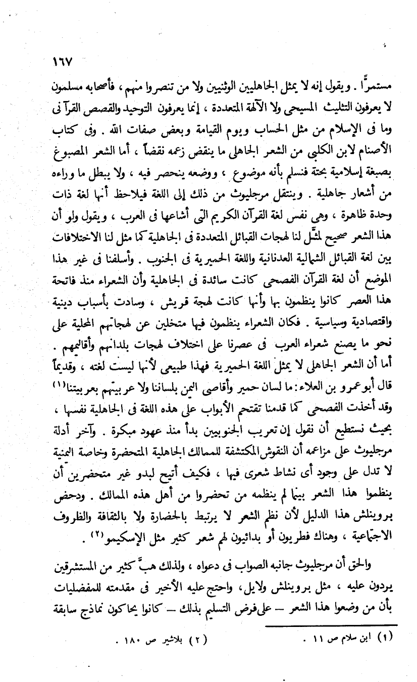 مستمرا. ويقول إنه لا يمثل الجاهليين الوثنيين ولا من تنصروا منهم، فأصحابه مسلمون لا يعرفون التثليث المسيحى ولا الآلهة المتعددة، إنما يعرفون التوحيد والقصص القرآنى وما فى الإسلام من مثل الحساب ويوم القيامة وبعض صفات الله. وفى كتاب الأصنام لابن الكلبى من الشعر الجاهلى ما ينقض زعمه نقضا، أما الشعر المصبوغ بصبغة إسلامية بحتة فنسلم بأنه موضوع، ووضعه ينحصر فيه، ولا يبطل ما وراءه من أشعار جاهلية. وينتقل مرجليوث من ذلك إلى اللغة فيلاحظ أنها لغة ذات وحدة ظاهرة، وهى نفس لغة القرآن الكريم التى أشاعها فى العرب، ويقول ولو أن هذا الشعر صحيح لمثّل لنا لهجات القبائل المتعددة فى الجاهلية كما مثل لنا الاختلافات بين لغة القبائل الشمالية العدنانية واللغة الحميرية فى الجنوب. وأسلفنا فى غير هذا الموضع أن لغة القرآن الفصحى كانت سائدة فى الجاهلية وأن الشعراء منذ فاتحة هذا العصر كانوا ينظمون بها وأنها كانت لهجة قريش، وسادت بأسباب دينية واقتصادية وسياسية. فكان الشعراء ينظمون فيها متخلين عن لهجاتهم المحلية على نحو ما يصنع شعراء العرب فى عصرنا على اختلاف لهجات بلدانهم وأقاليمهم.