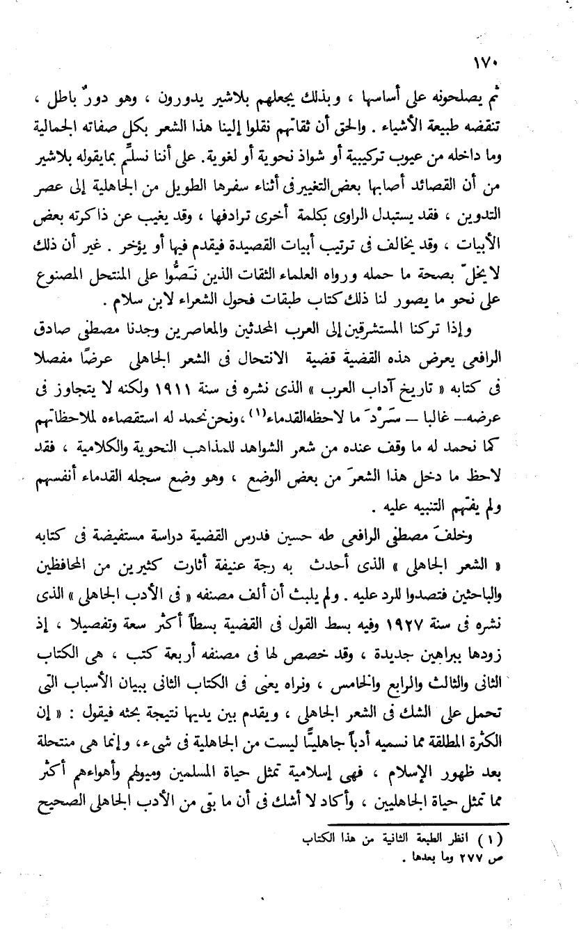 وإذا تركنا المستشرقين إلى العرب المحدثين والمعاصرين وجدنا مصطفى صادق الرافعى يعرض هذه القضية قضية الانتحال فى الشعر الجاهلى عرضا مفصلا فى كتابه «تاريخ آداب العرب» الذى نشره فى سنة 1911 ولكنه لا يتجاوز فى عرضه-غالبا-سرد ما لاحظه القدماء (¬1)، ونحن نحمد له استقصاءه لملاحظاتهم كما نحمد له ما وقف عنده من شعر الشواهد للمذاهب النحوية والكلامية، فقد لاحظ ما دخل هذا الشعر من بعض الوضع، وهو وضع سجله القدماء أنفسهم ولم يفتهم التنبيه عليه.
