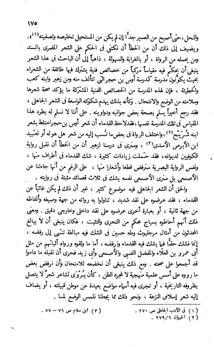 والحق أن الشعر الجاهلى فيه موضوع كثير، غير أن ذلك لم يكن غائبا عن القدماء، فقد عرضوه على نقد شديد، تناولوا به رواته من جهة وصيغه وألفاظه من جهة ثانية، أو بعبارة أخرى عرضوه على نقد داخلى وخارجى دقيق. ومعنى ذلك أنهم أحاطوه بسياج محكم من التحرى والتثبت، فكان ينبغى أن لا يبالغ المحدثون من أمثال مرجليوث وطه حسين فى الشك فيه مبالغة تنتهى إلى رفضه، إنما نشك حقا فيما يشك فيه القدماء ونرفضه، أما ما وثقوه ورواه أثباتهم من مثل أبى عمرو بن العلاء والمفضل الضبى والأصمعى وأبى زيد فحرى أن نقبله ما داموا قد أجمعوا على صحته. ومع ذلك ينبغى أن نخضعه للامتحان وأن نرفض بعض ما رووه على أسس علمية منهجية لا لمجرد الظن، كأن يروى لشاعر شعر لا يتصل بظروفه التاريخية، أو تجرى فيه أسماء مواضع بعيدة عن موطن قبيلته، أو يضاف إليه شعر إسلامى النزعة، ونحو ذلك مما يجعلنا نلمس الوضع لمسا.
